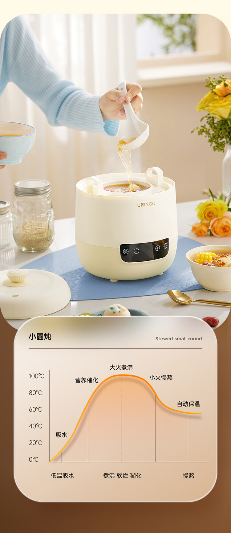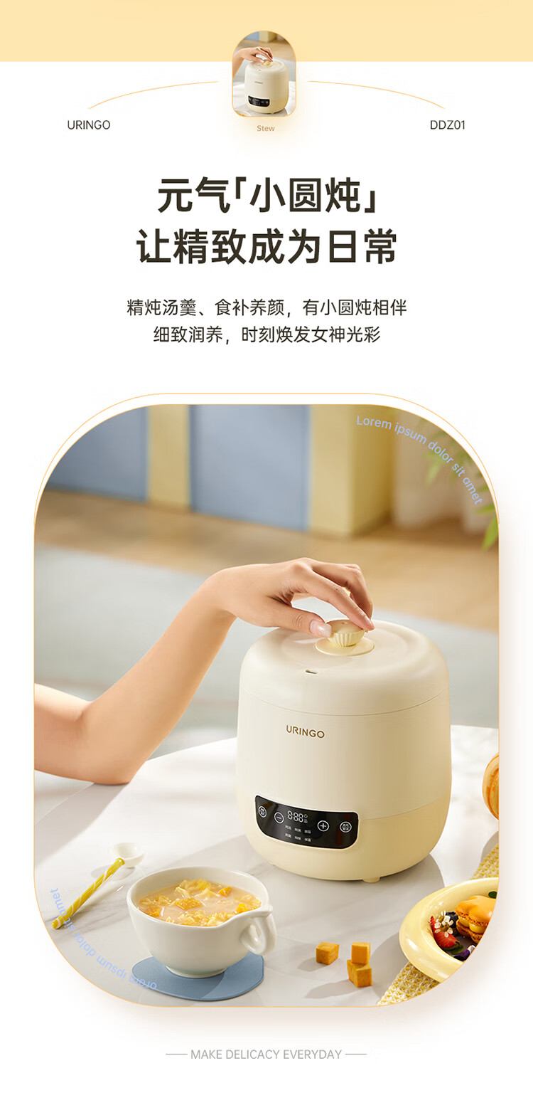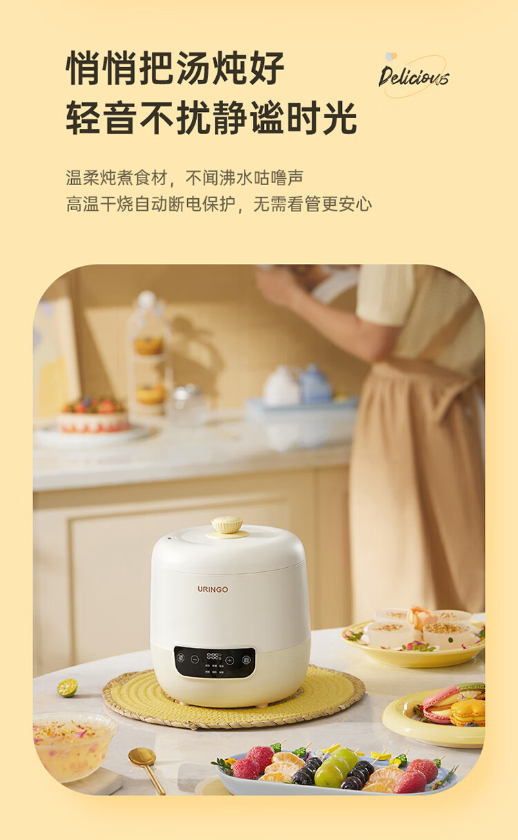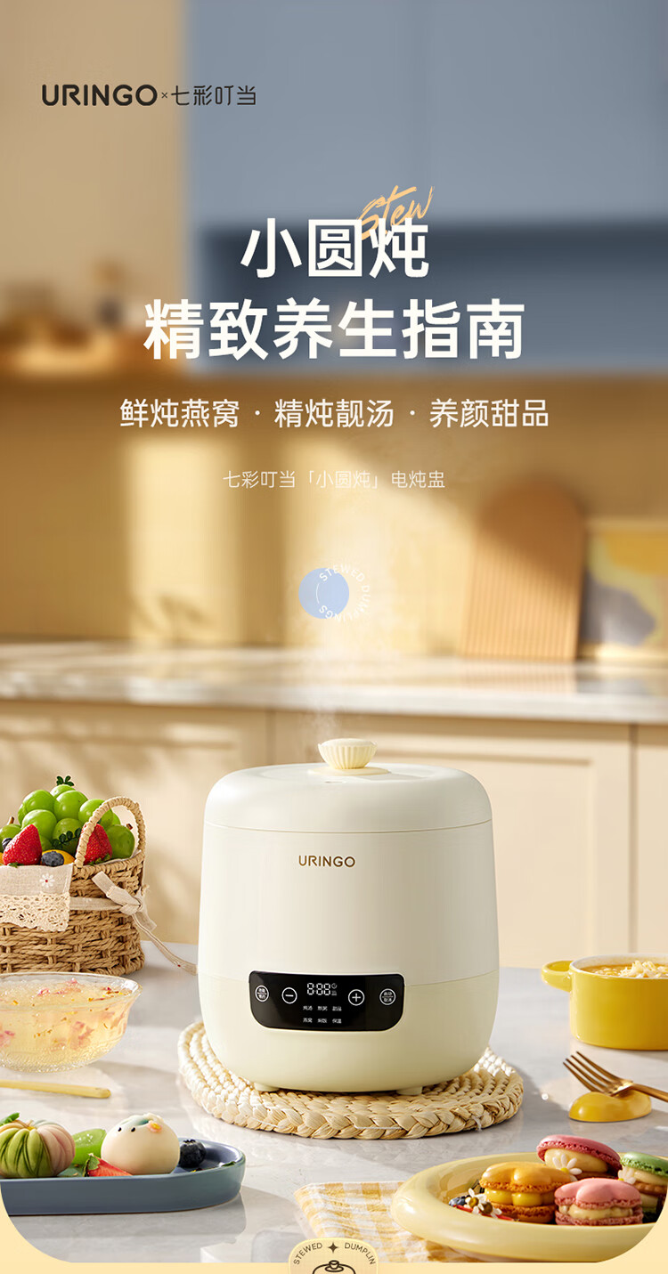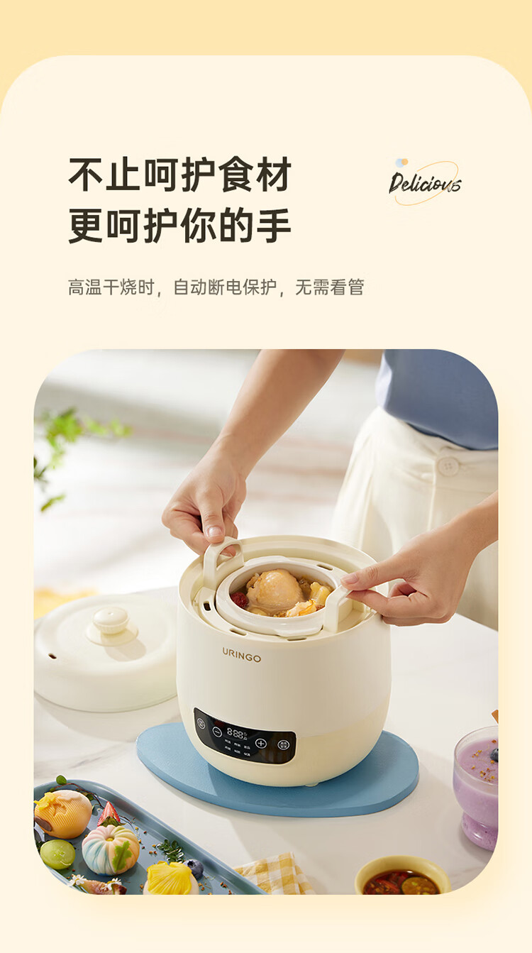 90% new Colorful Dingdang (URINGO) electric stew pot, water-proof stew pot, electric casserole, 0.8L white porcelain inner pot, dry-proof mini electric stew pot, bb pot, baby food supplement pot DDZ01