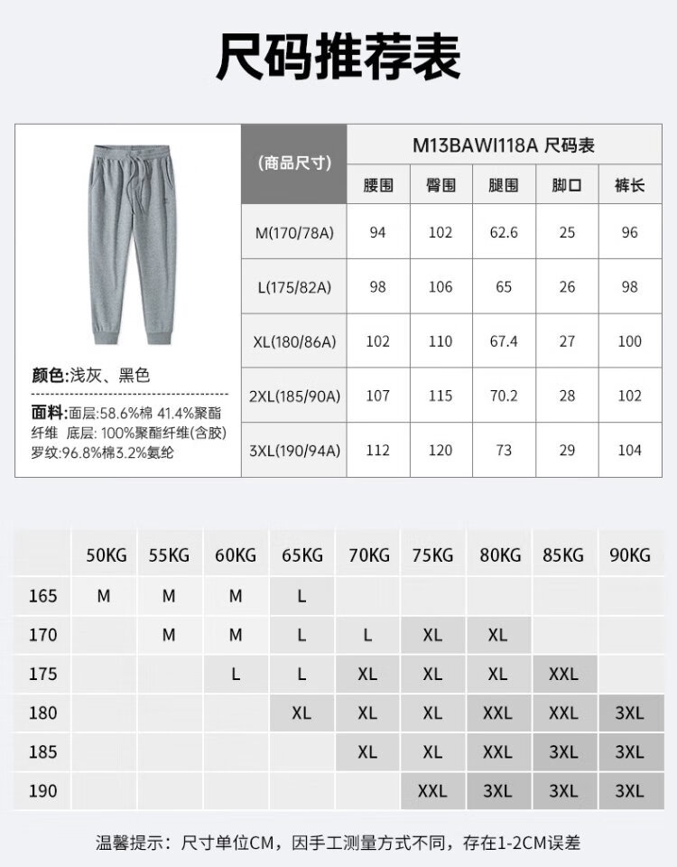 China (cm) 165 / 88-90 170 / 96-98 175 / 108-110 180 / 118-122 185 / 126-130