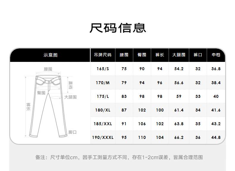Outseam (cm) 99 cm 101.5 cm 104 cm 106.5 cm 109 cm