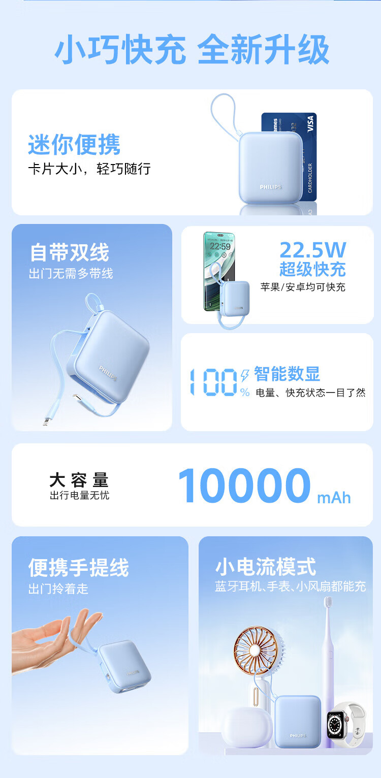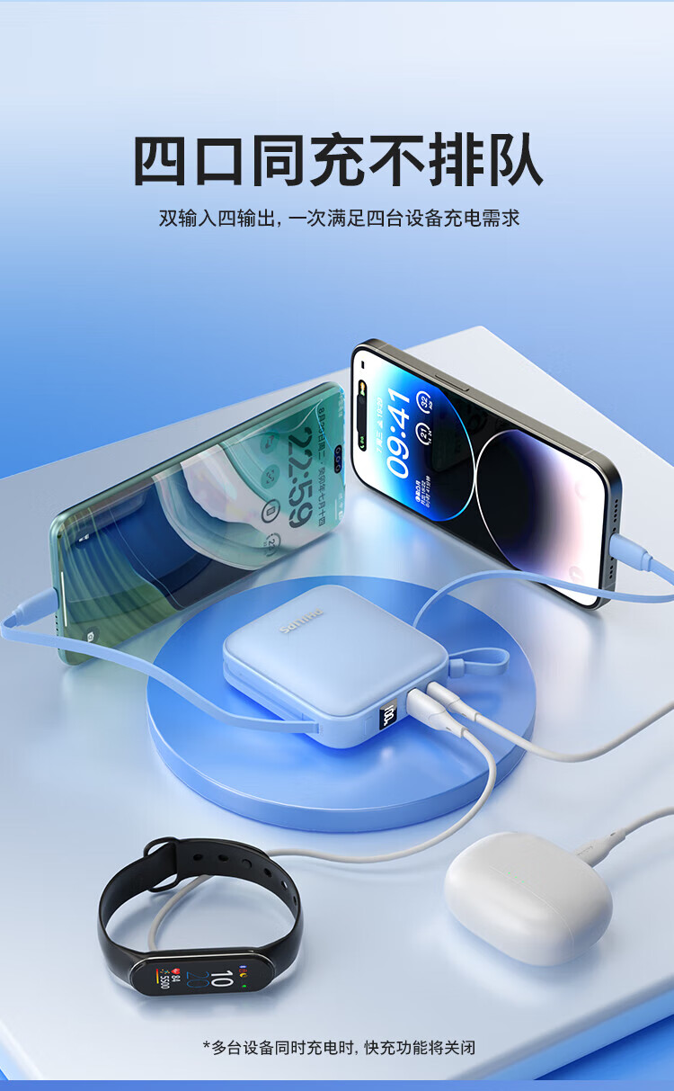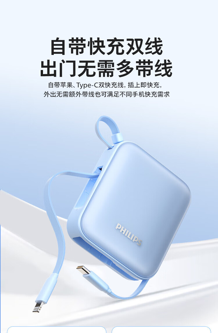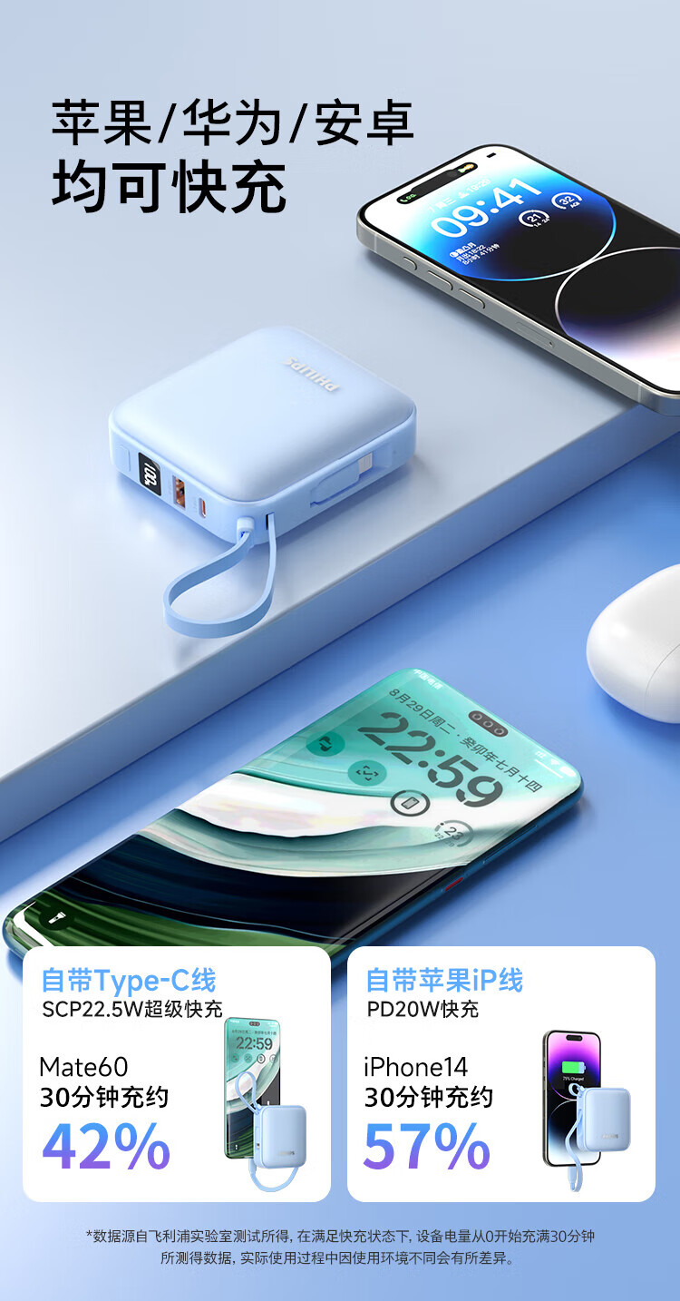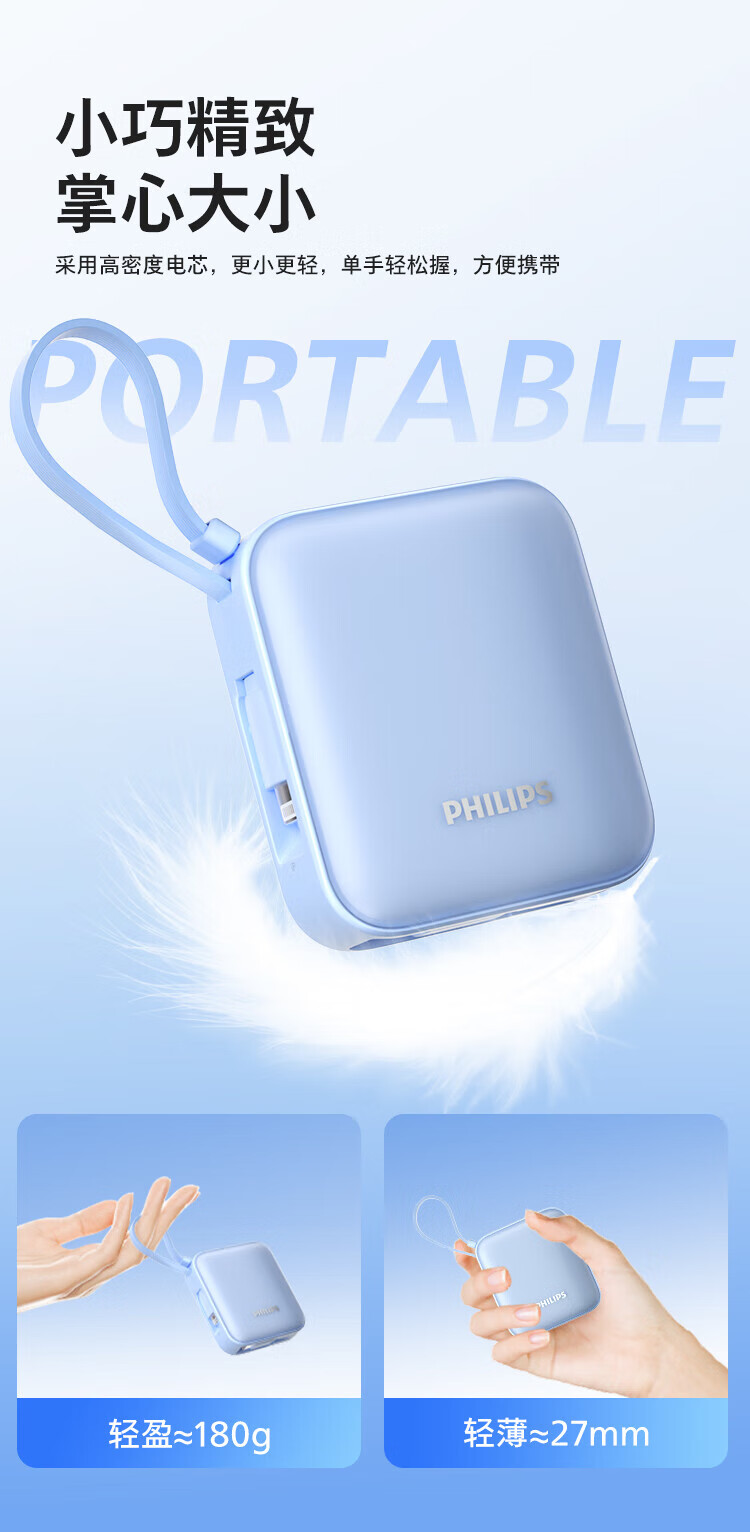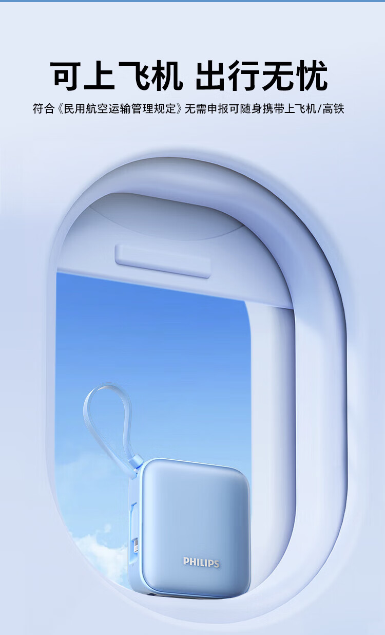 Philips 3C certification can be used on airplanes. The power bank comes with dual-wire 22.5W super fast charging. Mini, compact and portable 10,000 mAh mobile power supply suitable for Apple 17 and Huawei.