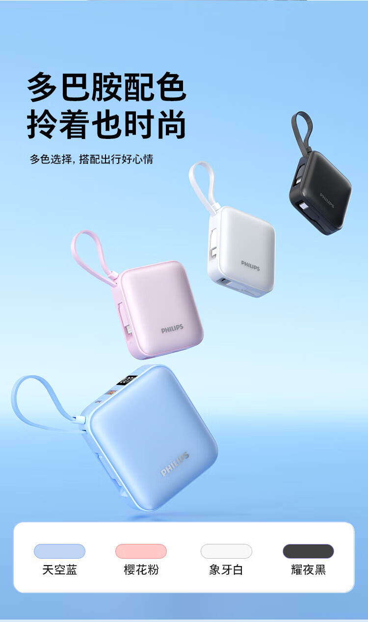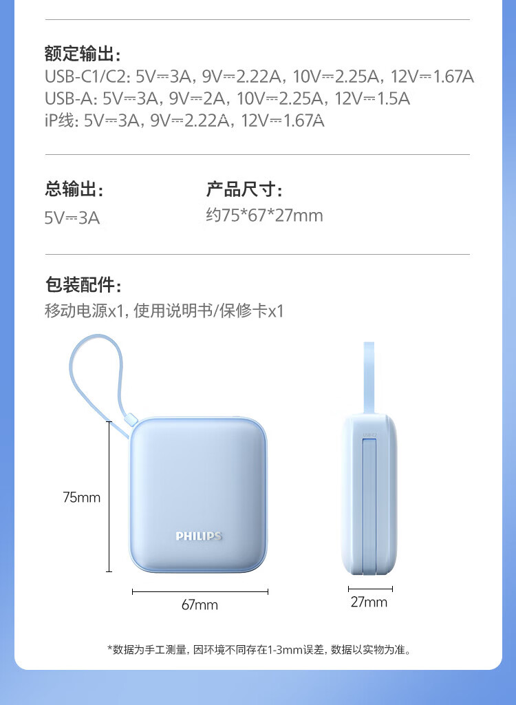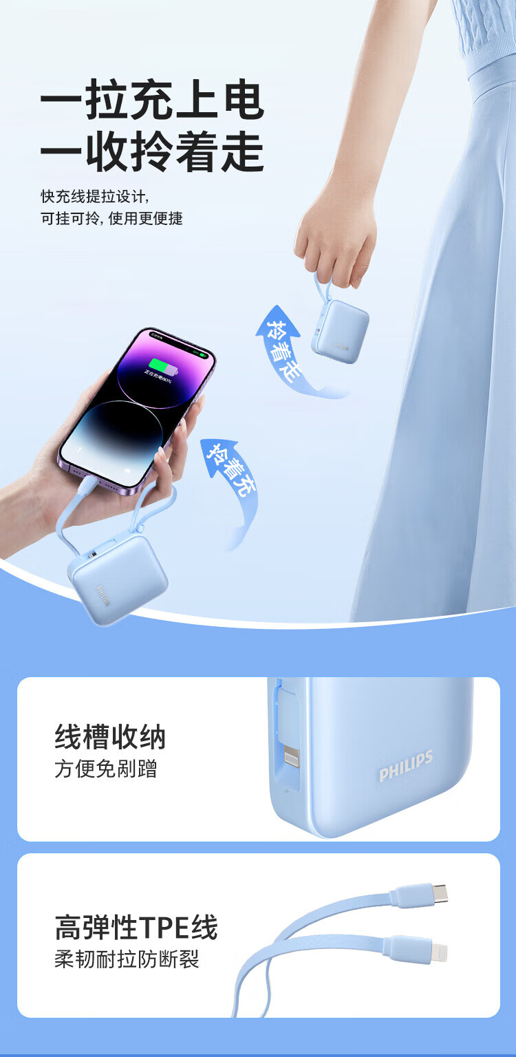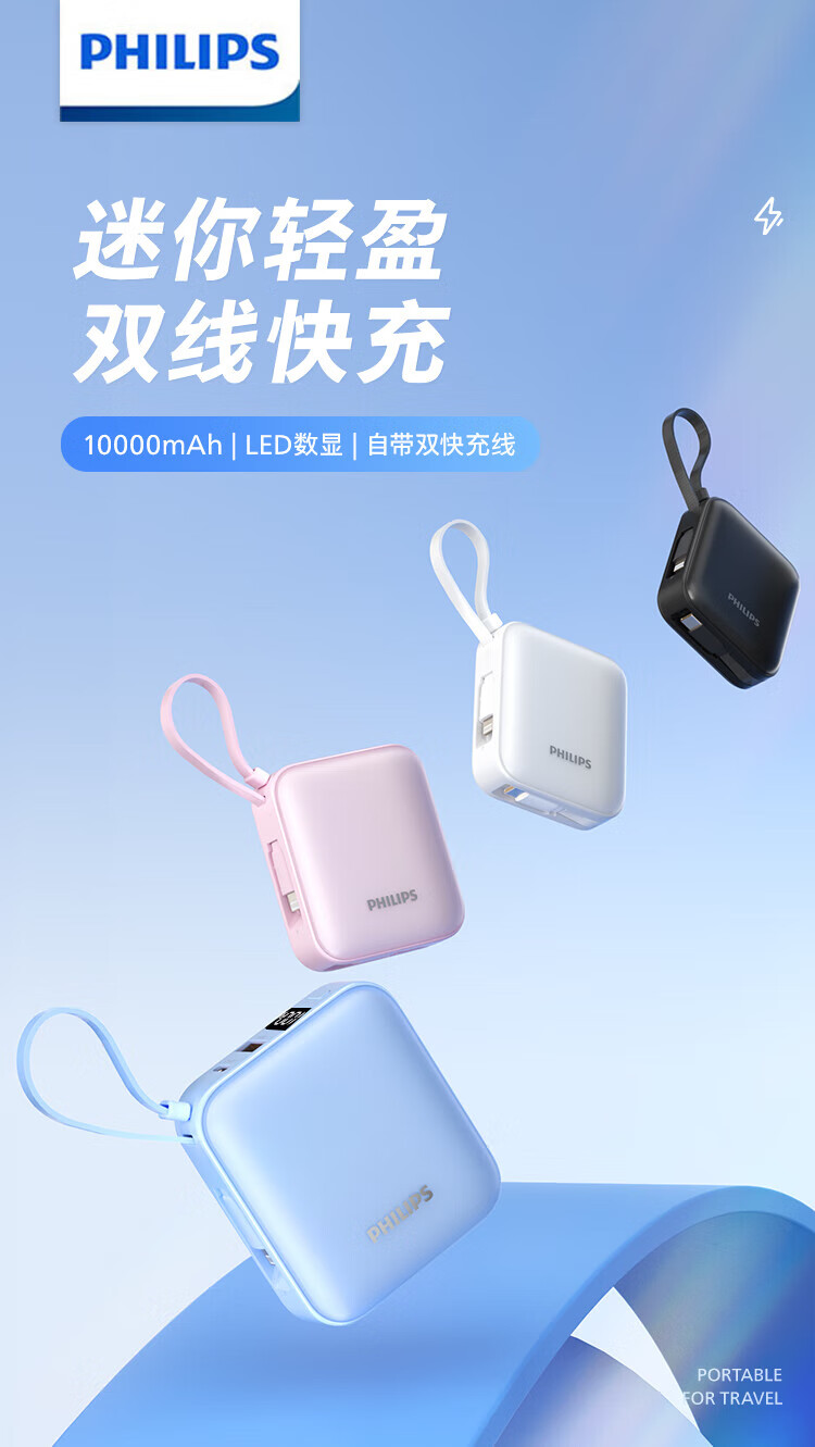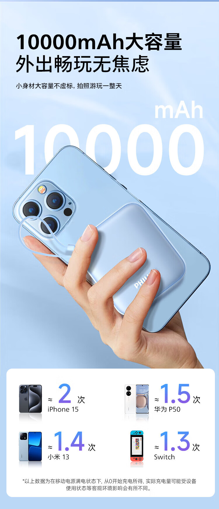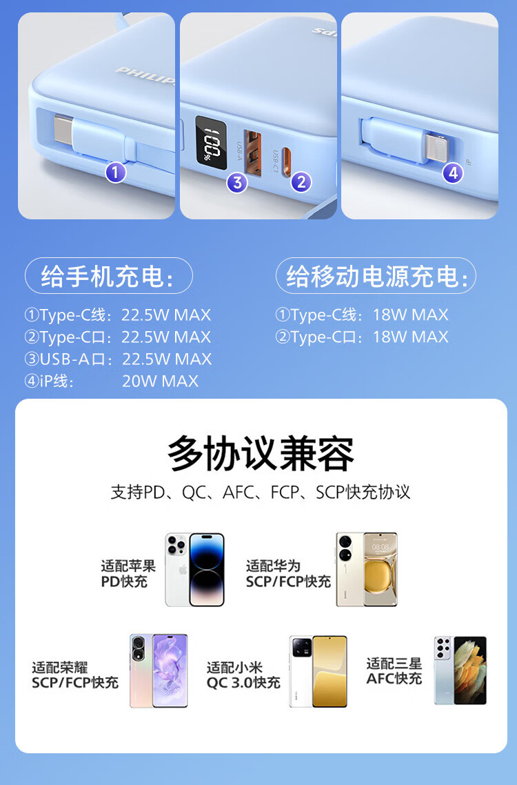 Philips 3C certification can be used on airplanes. The power bank comes with dual-wire 22.5W super fast charging. Mini, compact and portable 10,000 mAh mobile power supply suitable for Apple 17 and Huawei.