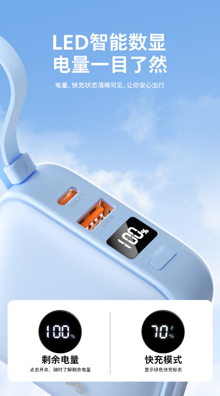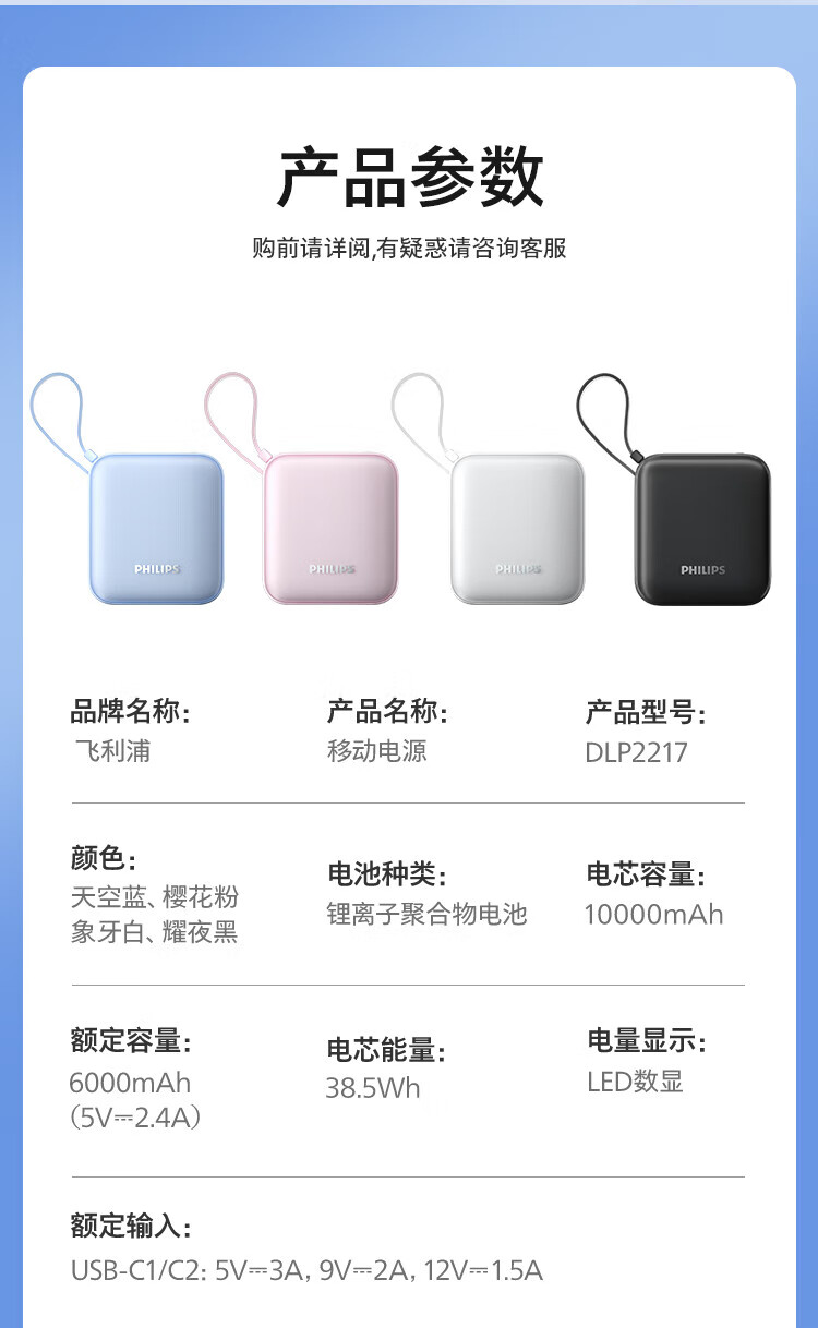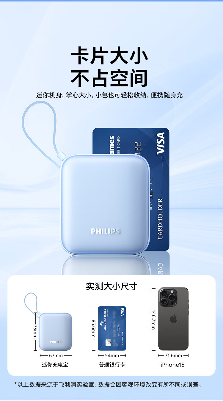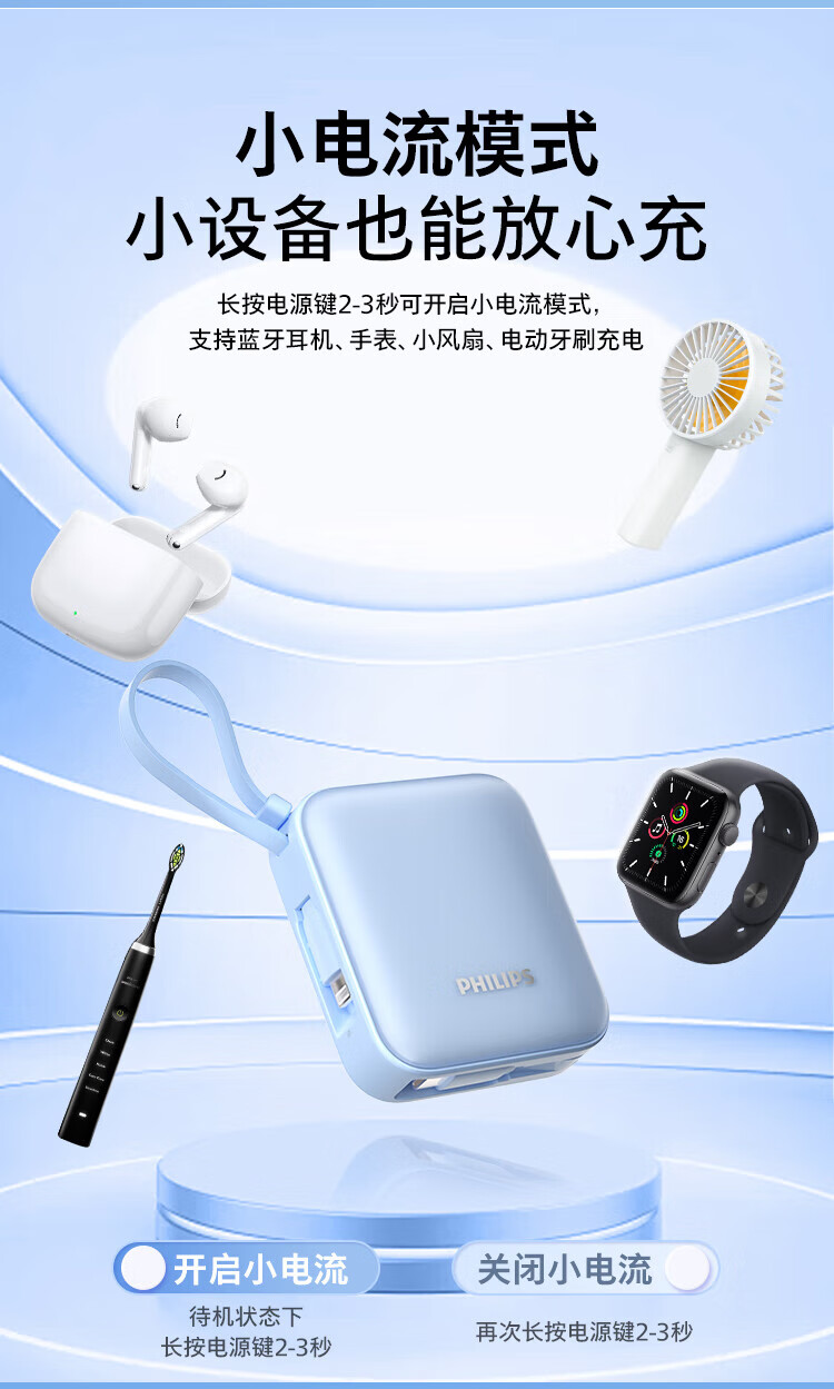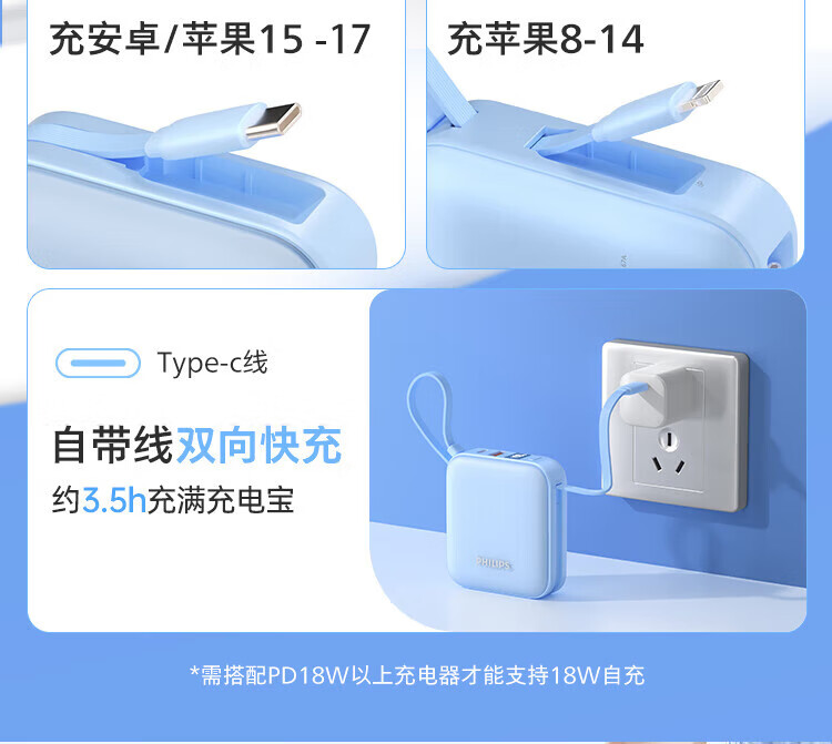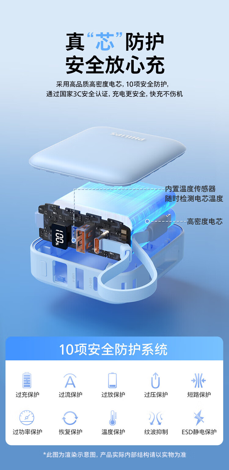 Philips 3C certification can be used on airplanes. The power bank comes with dual-wire 22.5W super fast charging. Mini, compact and portable 10,000 mAh mobile power supply suitable for Apple 17 and Huawei.