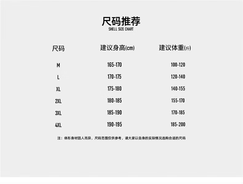 China (cm) 165 / 88-90 170 / 96-98 175 / 108-110 180 / 118-122 185 / 126-130