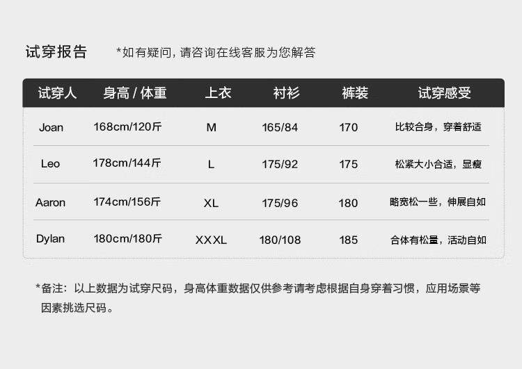 China (cm) 160-165/84-86 165-170 / 88-90 167-172 / 92-96 168-173 / 98-102 170-176 / 106-110