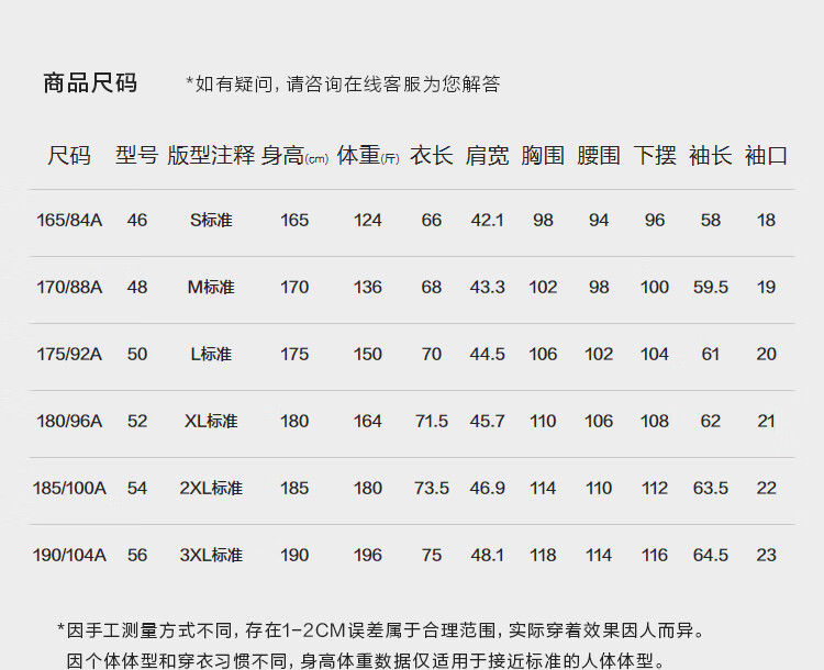 China (cm) 165 / 88-90 170 / 96-98 175 / 108-110 180 / 118-122 185 / 126-130