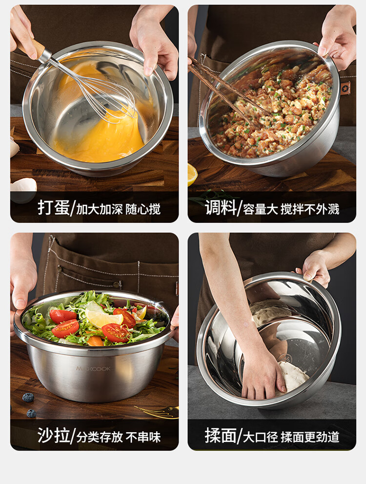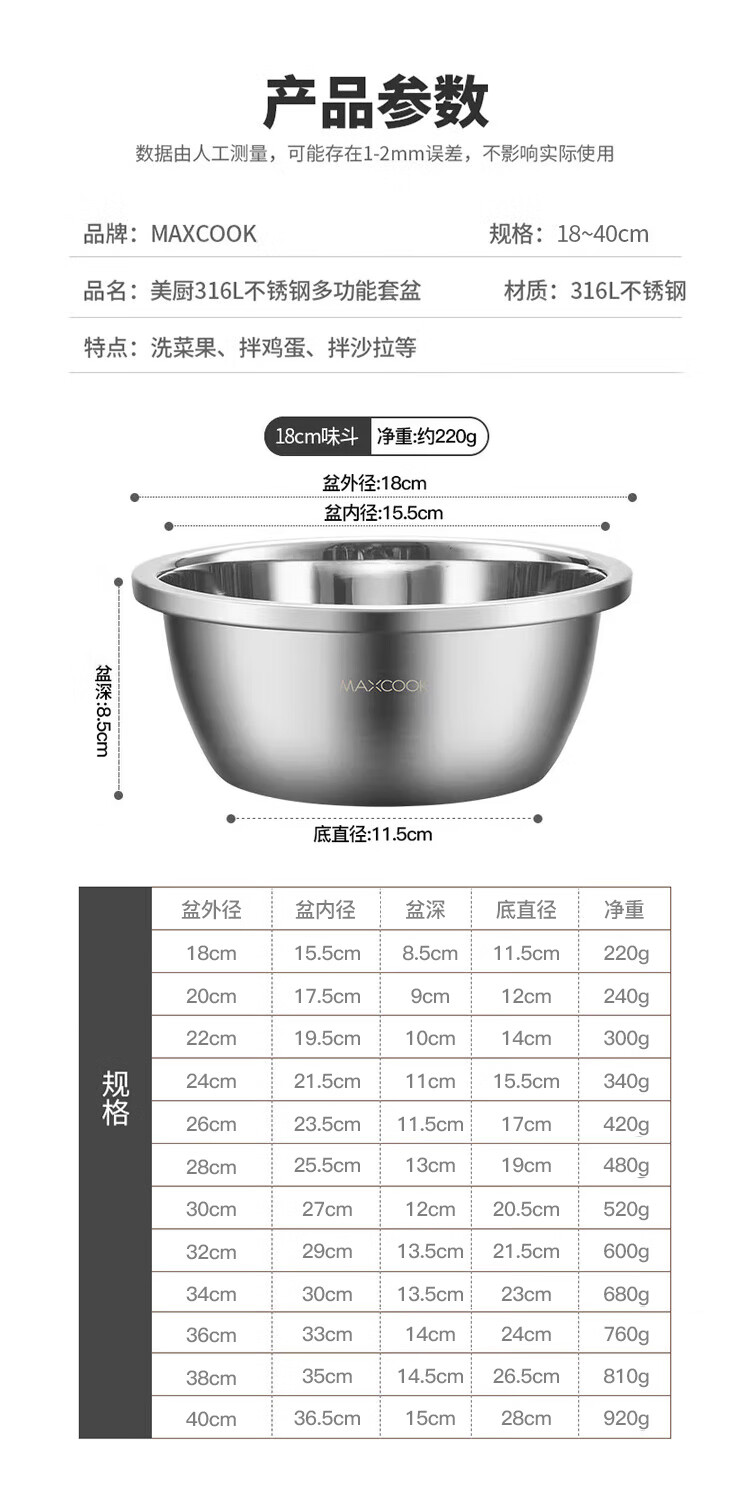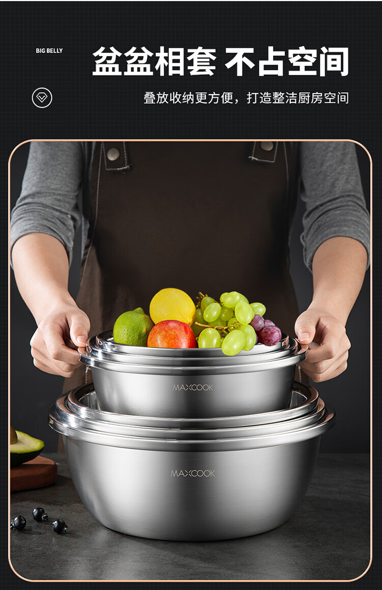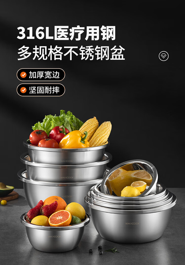 MAXCOOK 316L stainless steel basin, seasoning basin, thickened saucepan 40CM, vegetable basin, salad basin and basin MCWA1143