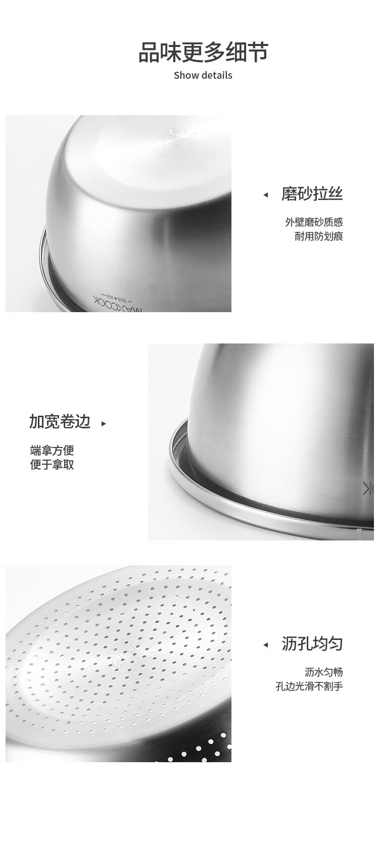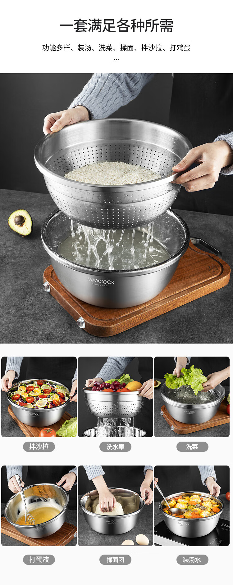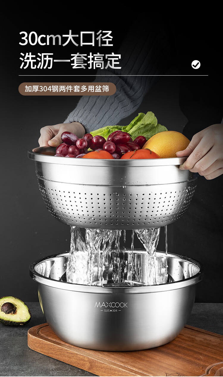 MAXCOOK 304 stainless steel basin sieve 2-piece set 30cm thickened large wash basin rice sieve and flavor bucket set MCWA1167