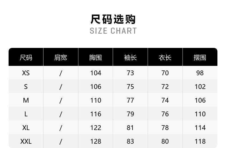 China (cm) 160-165/84-86 165-170 / 88-90 167-172 / 92-96 168-173 / 98-102 170-176 / 106-110