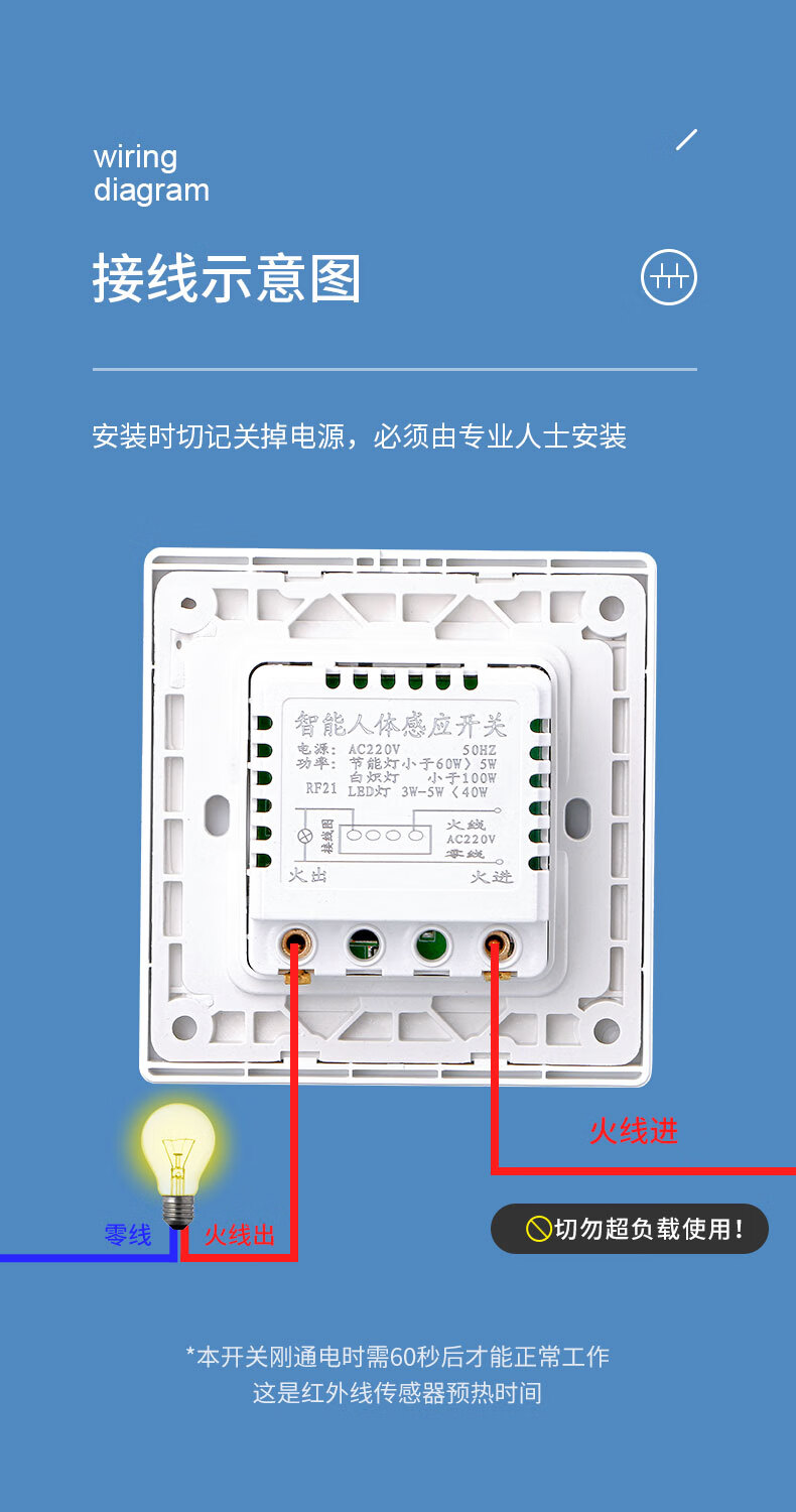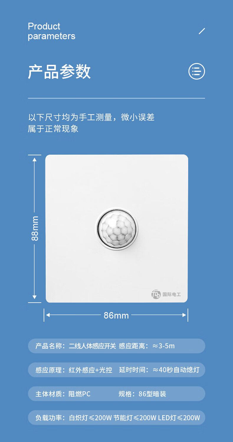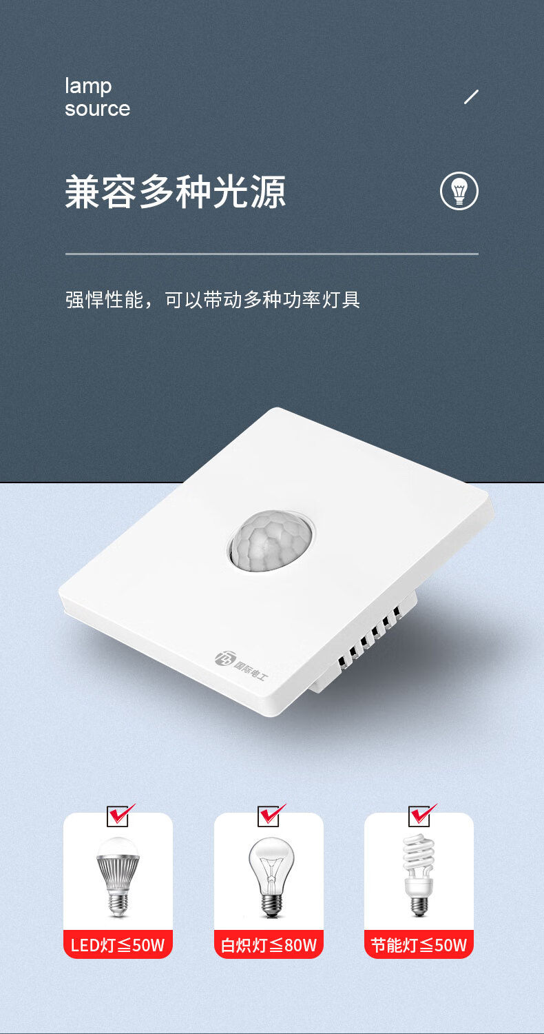 International Electrician (FDD) Type 86 Concealed Human Body Sensor Switch Intelligent Light Control Lamp Human Body Infrared Delay Human Body Sensor Delay Switch-White