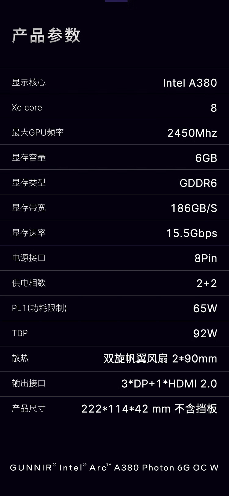 GUNNIR intel Arc A380 Photon 6G 2450MHz GDDR6 OC W game graphics card design video editing desktop computer graphics card