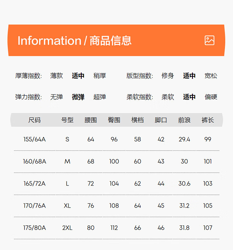 Outseam (cm) 99 cm 101.5 cm 104 cm 106.5 cm 109 cm