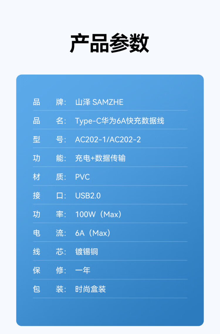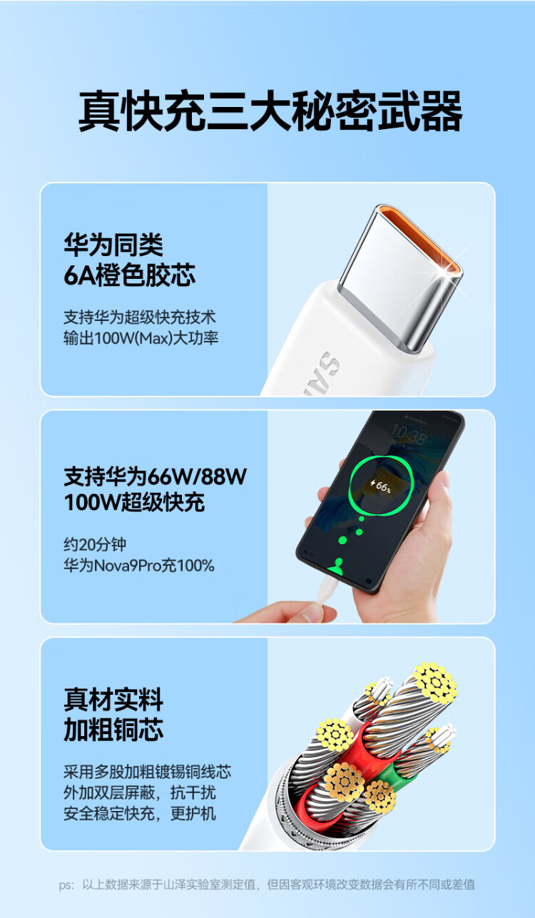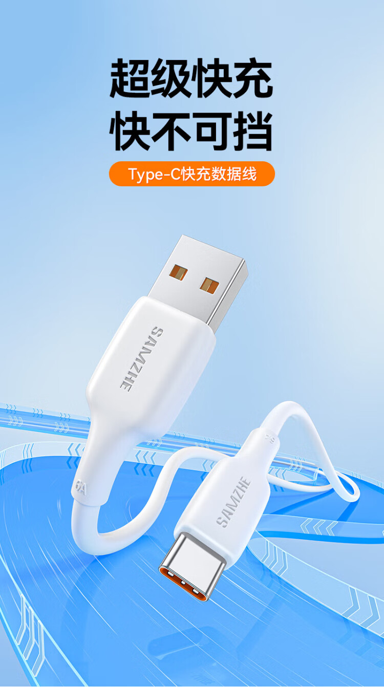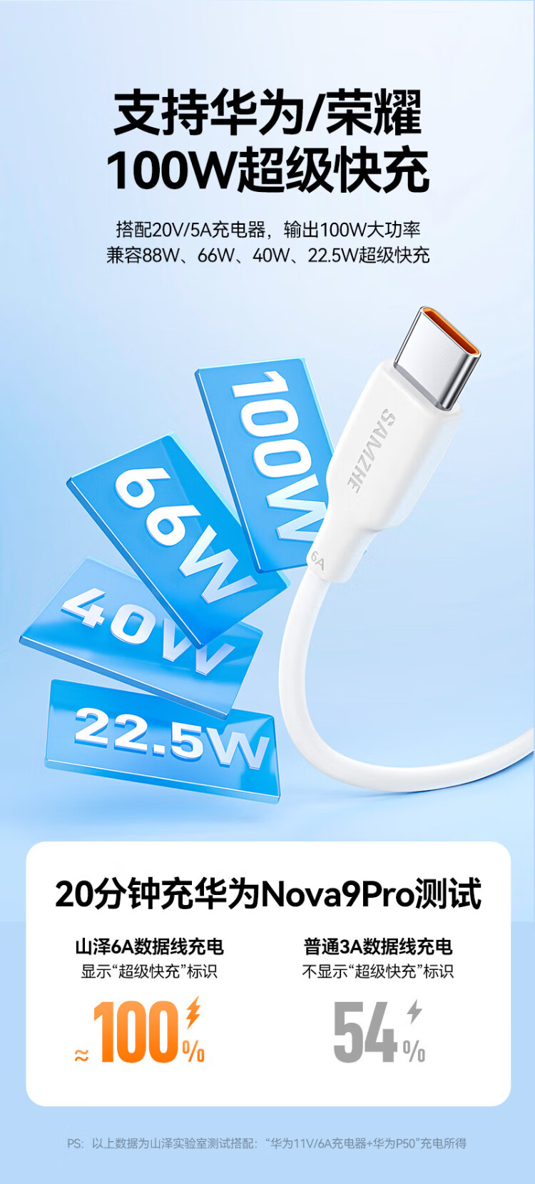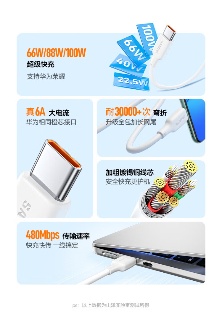 Shanze Type-C data cable 100W super fast charging cable 6A suitable for Huawei Pura70/Mate60/50 Honor 66W Xiaomi vivo Android mobile phone car charging cable 1 meter
