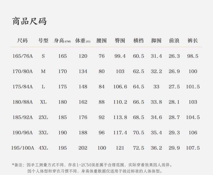 Outseam (cm) 99 cm 101.5 cm 104 cm 106.5 cm 109 cm