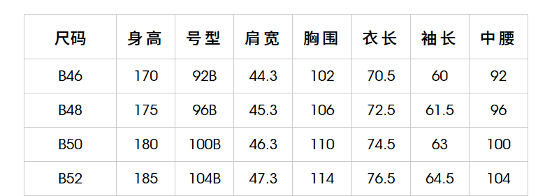 China (cm) 160-165/84-86 165-170 / 88-90 167-172 / 92-96 168-173 / 98-102 170-176 / 106-110