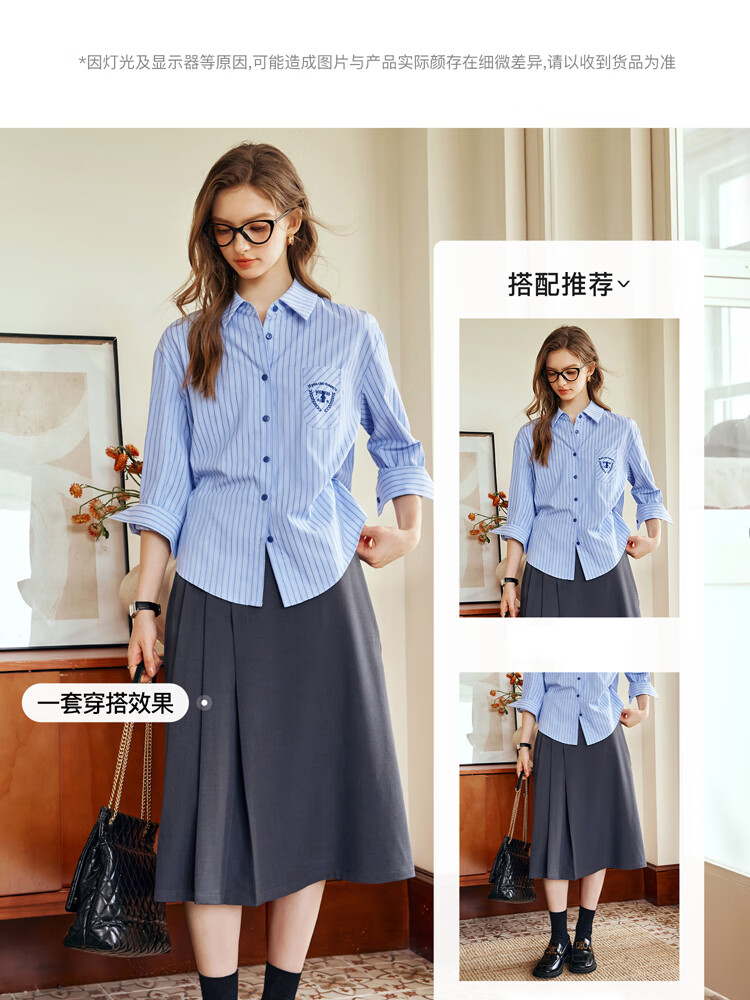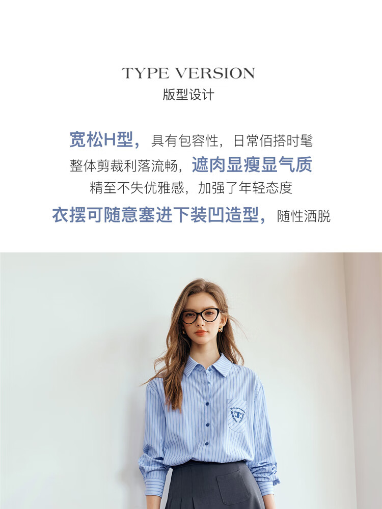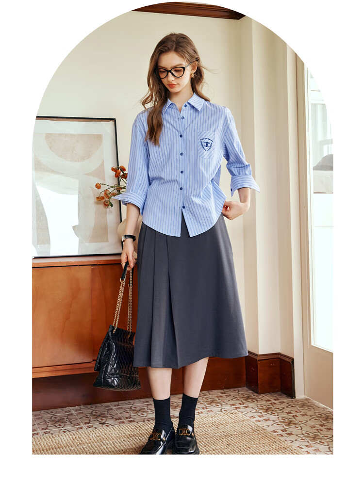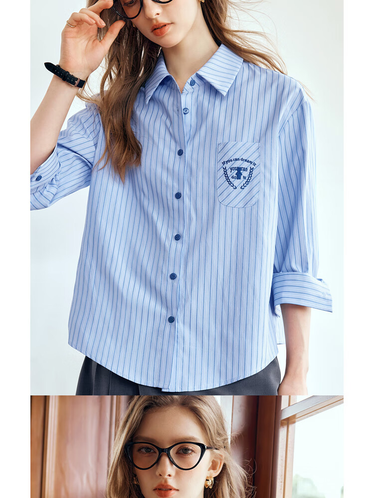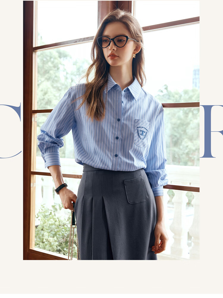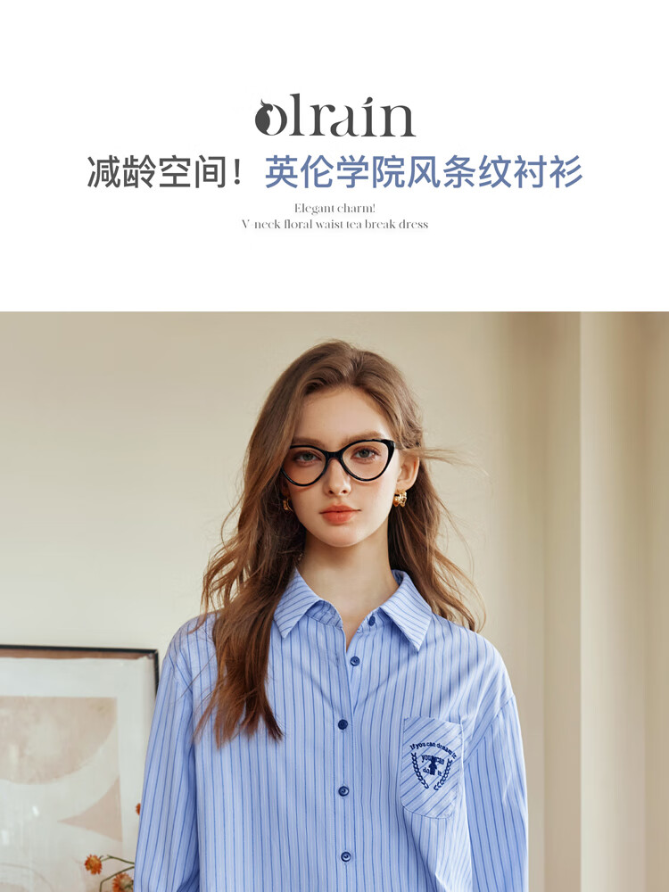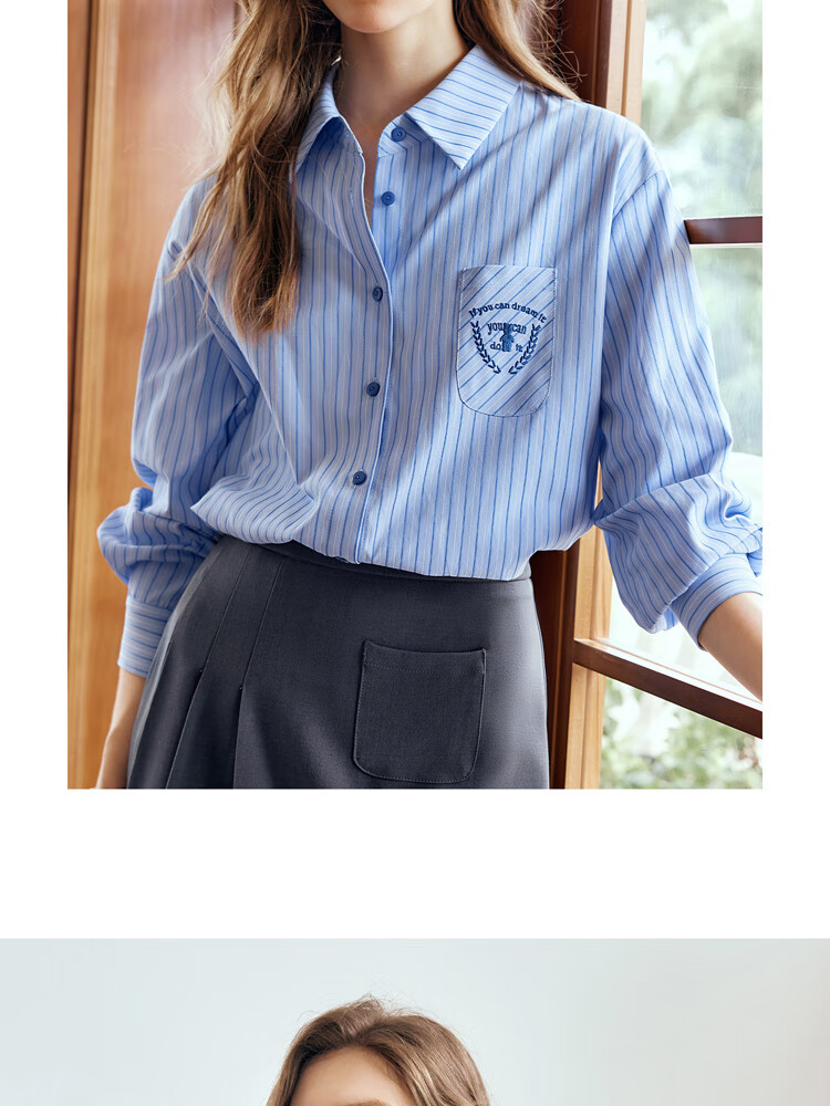 Olrain striped long-sleeved shirt women's autumn British college style commuting shirt blue striped L