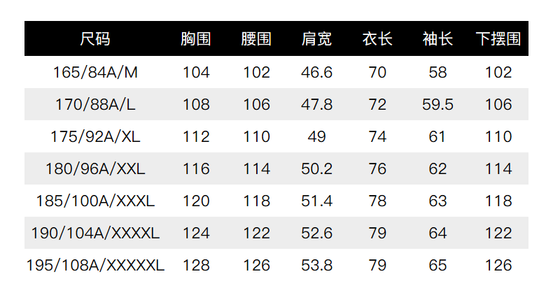 China (cm) 160-165/84-86 165-170 / 88-90 167-172 / 92-96 168-173 / 98-102 170-176 / 106-110