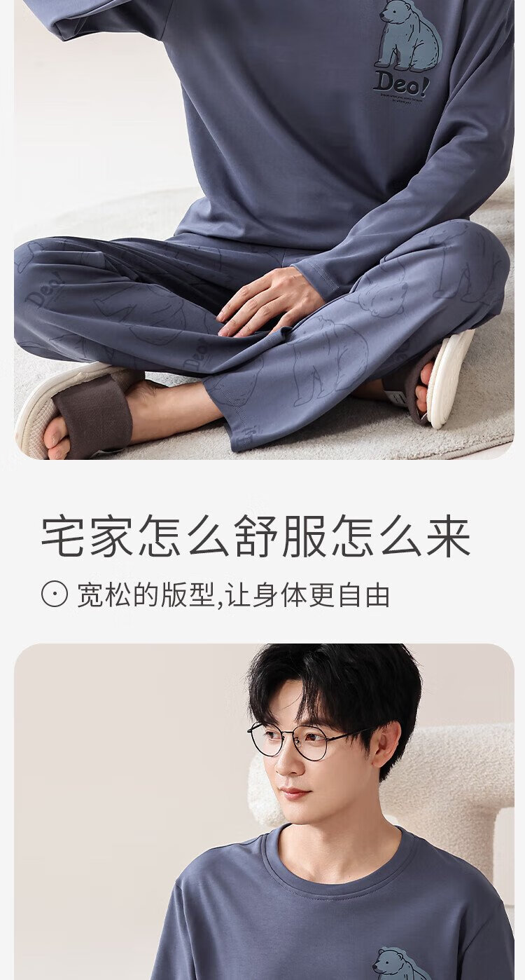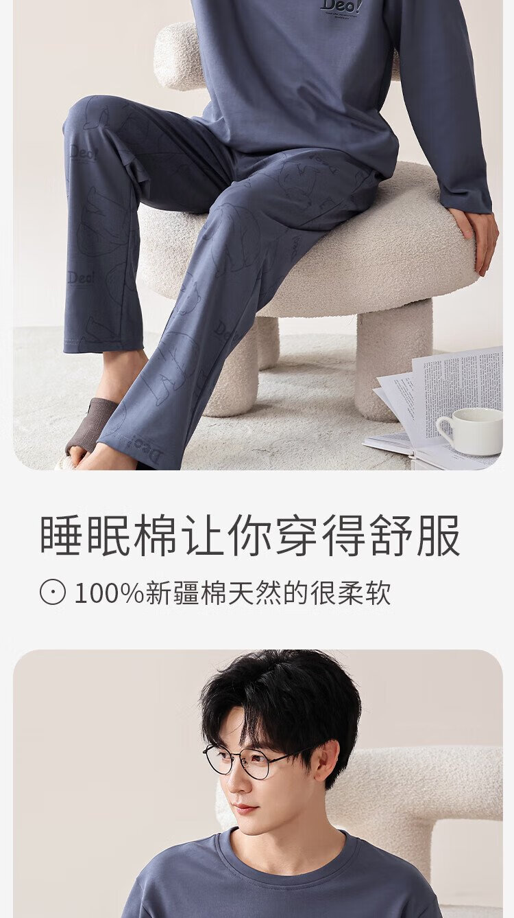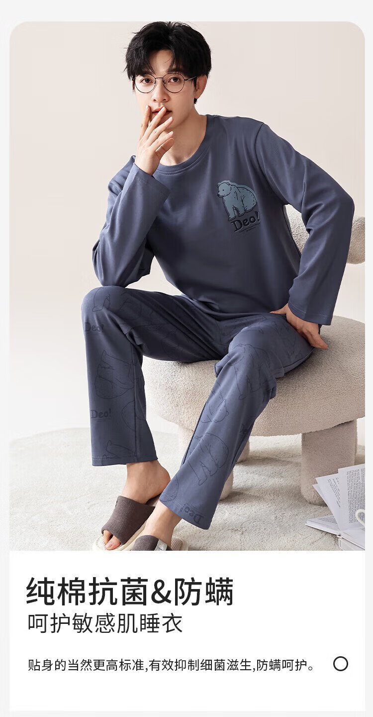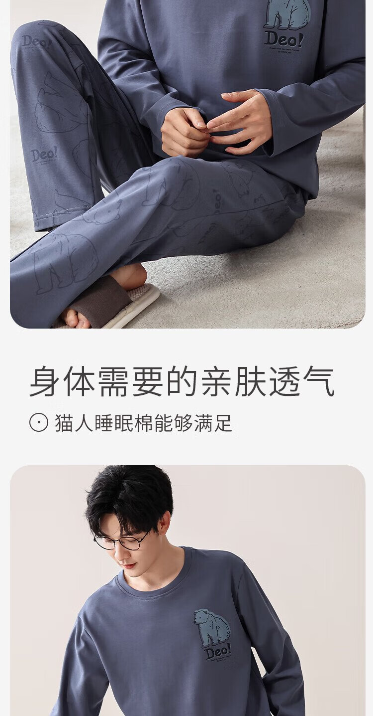 Catman men's pajamas for men, pure cotton antibacterial and anti-mite, fashionable loose long-sleeved pullover home wear blue 2XL