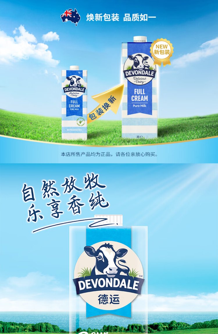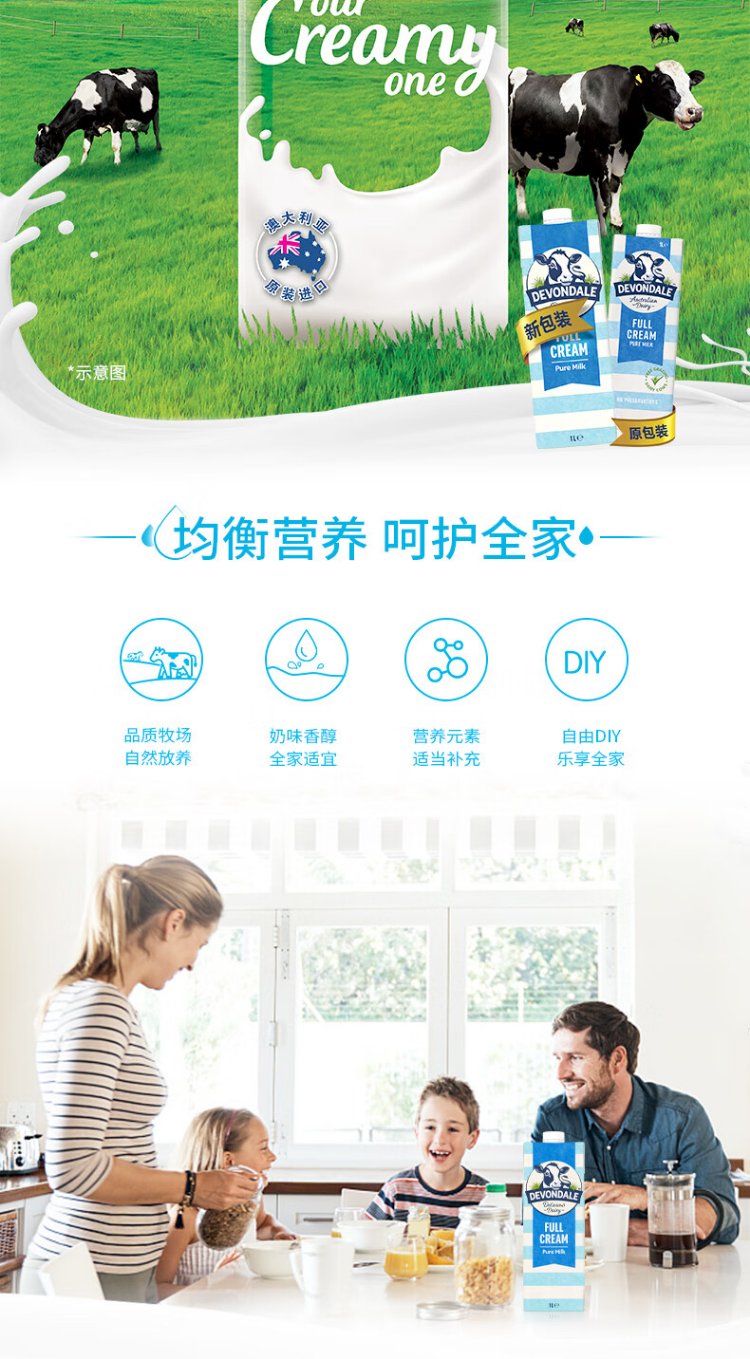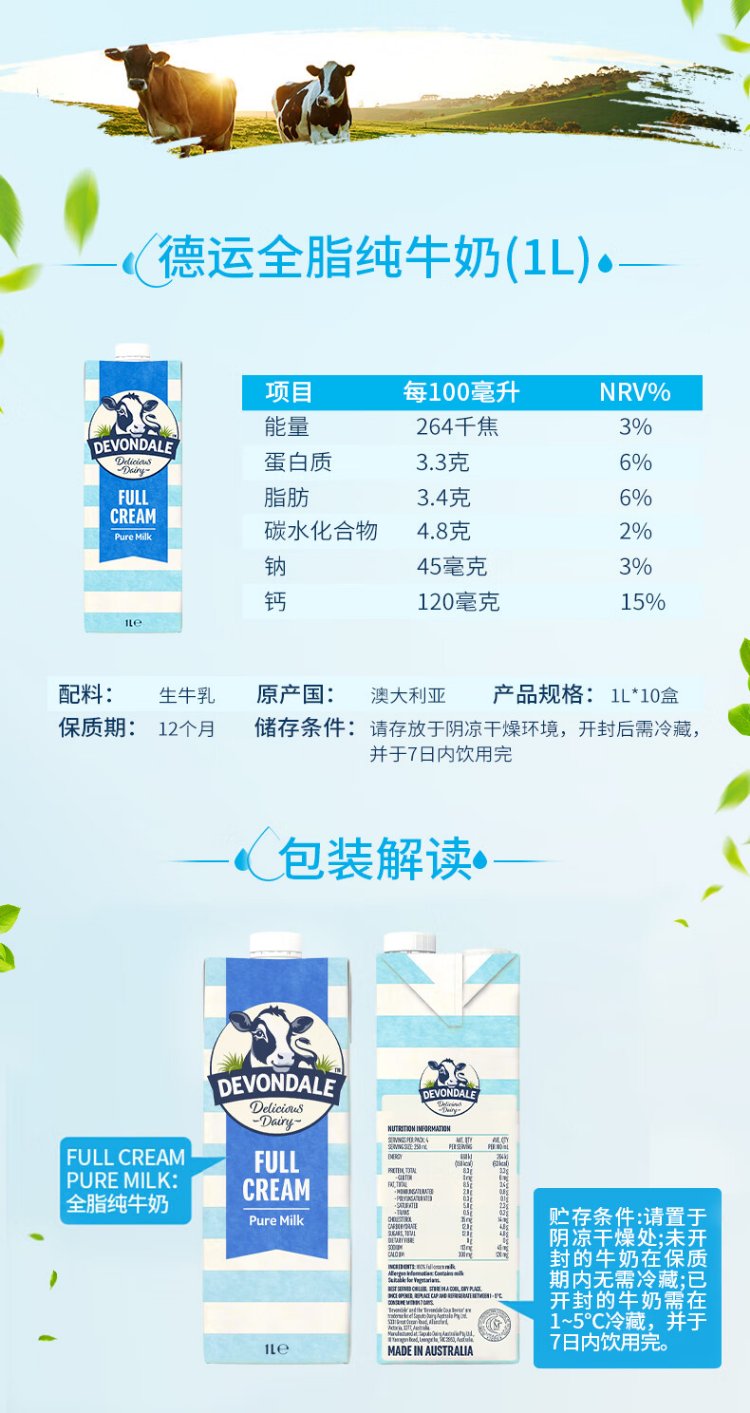 Devondale whole milk pure milk 1L*10 boxes, high calcium imported milk, minimum order of 10 boxes