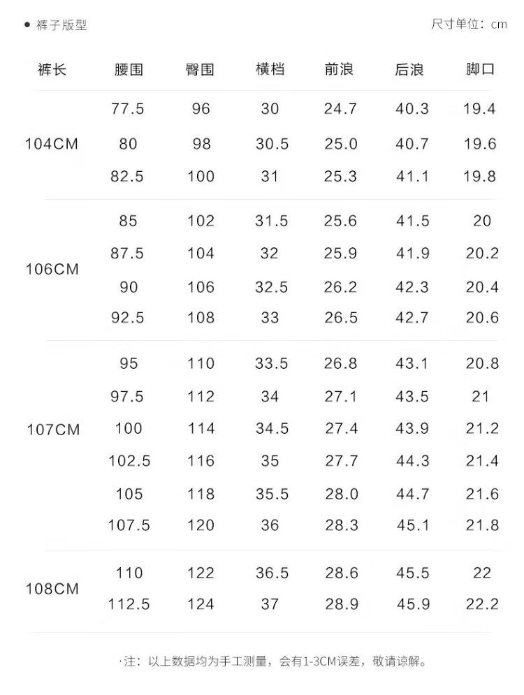 Outseam (cm) 99 cm 101.5 cm 104 cm 106.5 cm 109 cm