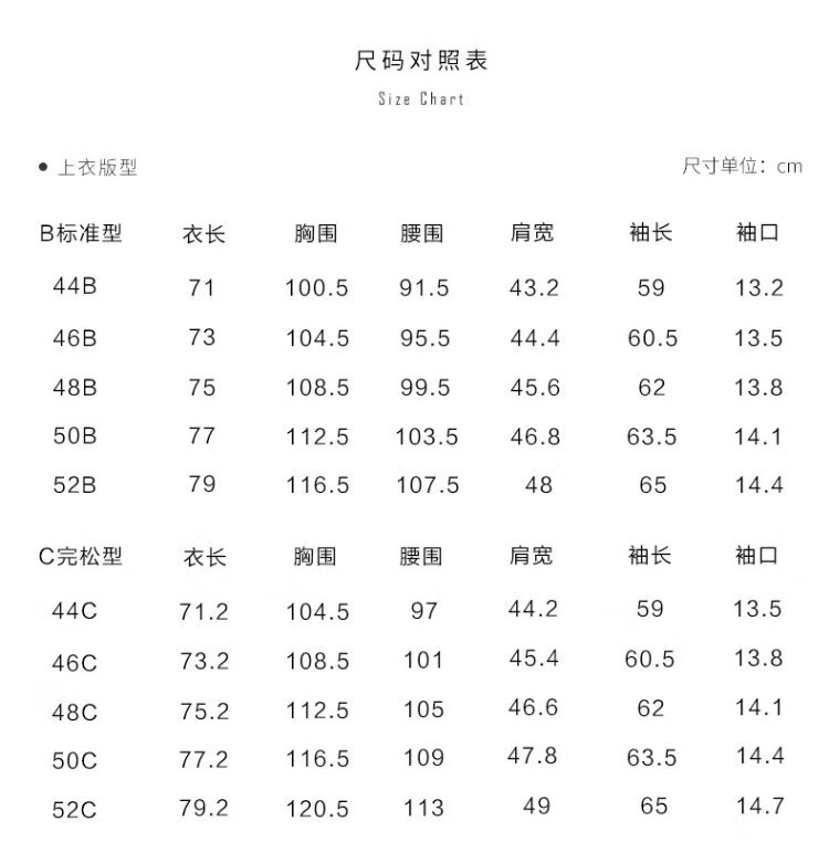 China (cm) 160-165/84-86 165-170 / 88-90 167-172 / 92-96 168-173 / 98-102 170-176 / 106-110