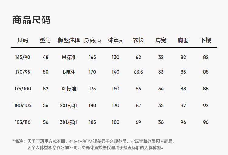 China (cm) 160-165/84-86 165-170 / 88-90 167-172 / 92-96 168-173 / 98-102 170-176 / 106-110
