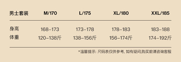 China (cm) 165 / 88-90 170 / 96-98 175 / 108-110 180 / 118-122 185 / 126-130