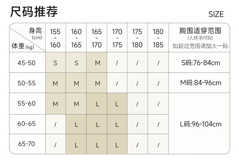 China (cm) 160-165/84-86 165-170 / 88-90 167-172 / 92-96 168-173 / 98-102 170-176 / 106-110