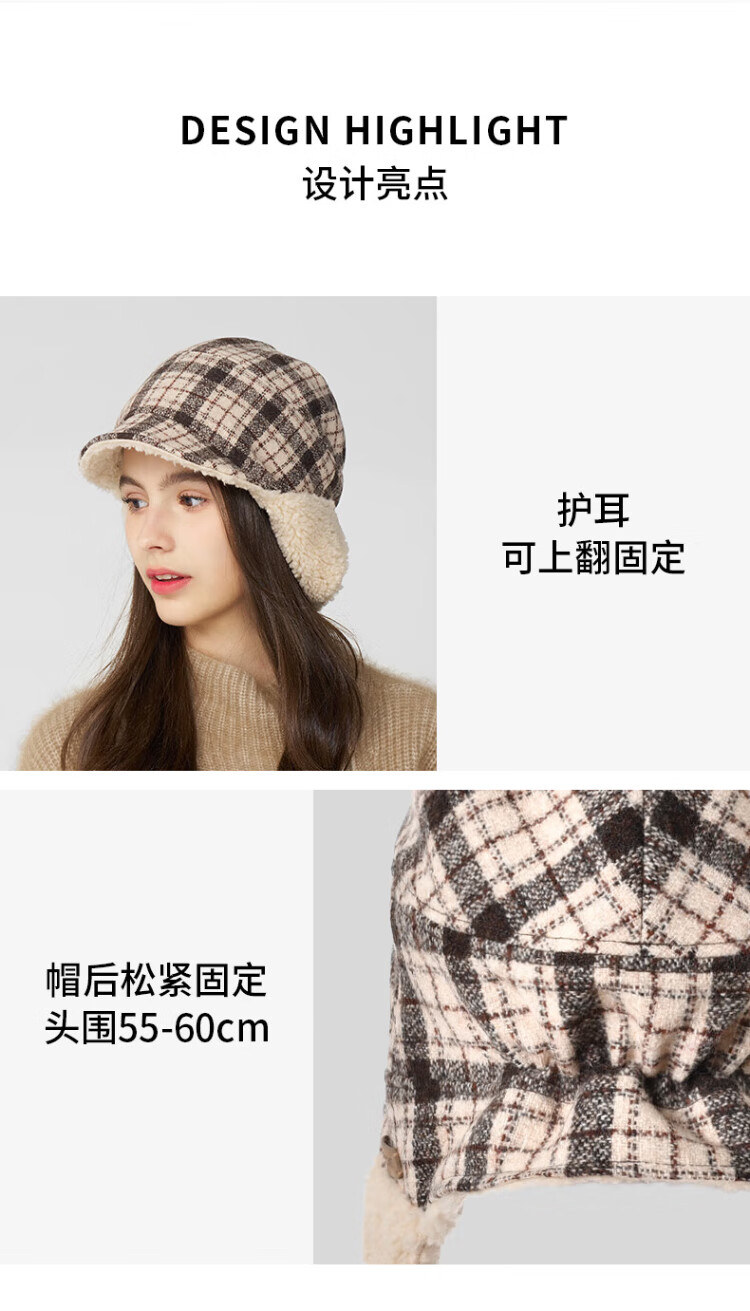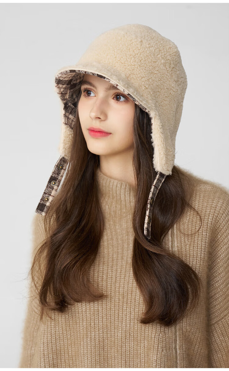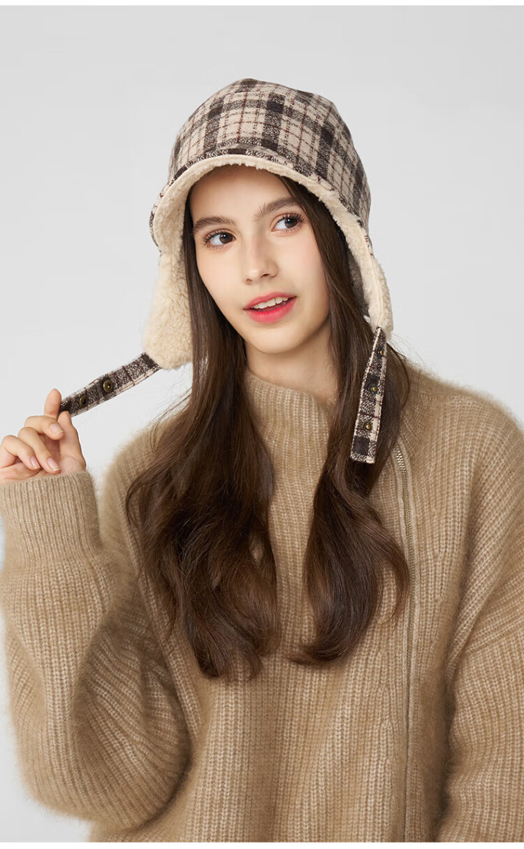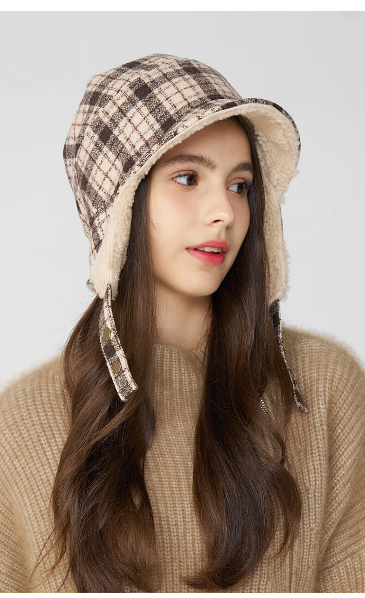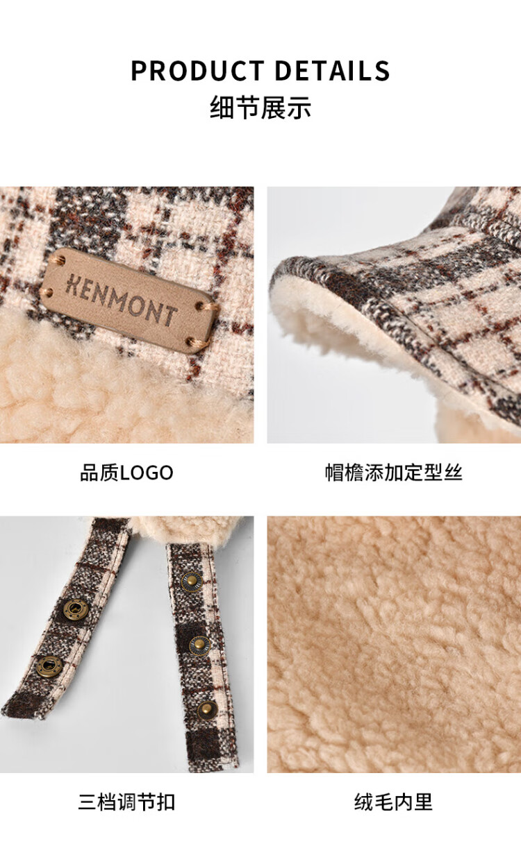 Kenmont wool plaid ear protection beret women's lamb velvet thickened warm double-sided peaked cap km-5264