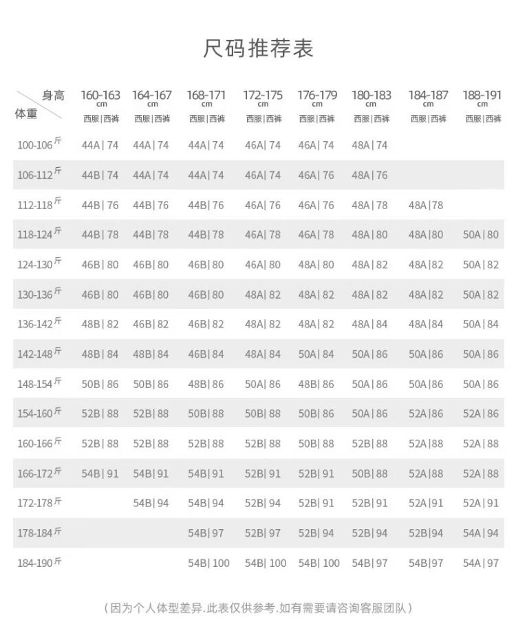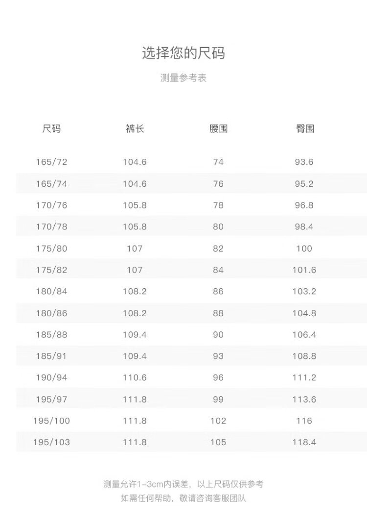 China (cm) 160-165/84-86 165-170 / 88-90 167-172 / 92-96 168-173 / 98-102 170-176 / 106-110