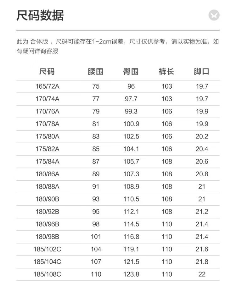 China (cm) 160-165/84-86 165-170 / 88-90 167-172 / 92-96 168-173 / 98-102 170-176 / 106-110