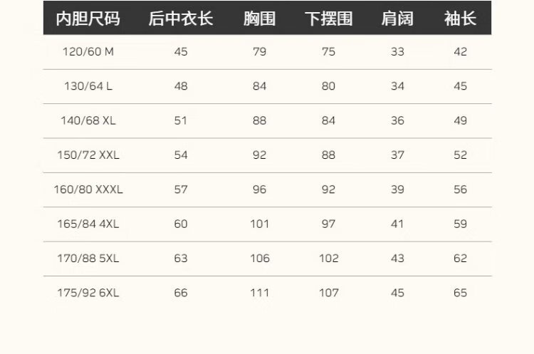 China (cm) 160-165/84-86 165-170 / 88-90 167-172 / 92-96 168-173 / 98-102 170-176 / 106-110