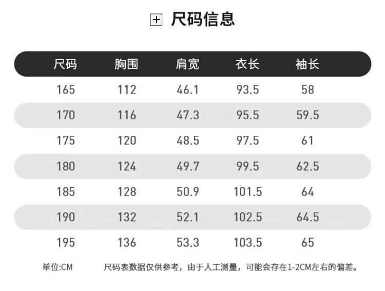 China (cm) 165 / 88-90 170 / 96-98 175 / 108-110 180 / 118-122 185 / 126-130