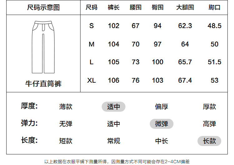 Outseam (cm) 99 cm 101.5 cm 104 cm 106.5 cm 109 cm