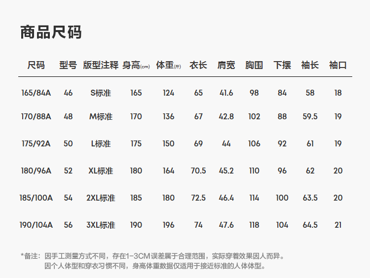 China (cm) 165 / 88-90 170 / 96-98 175 / 108-110 180 / 118-122 185 / 126-130
