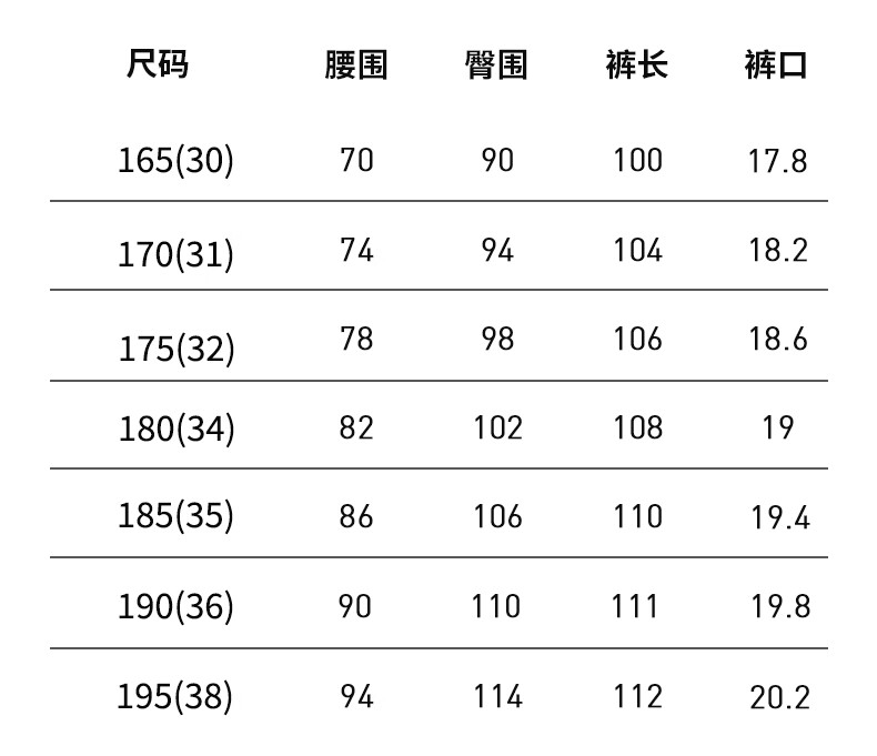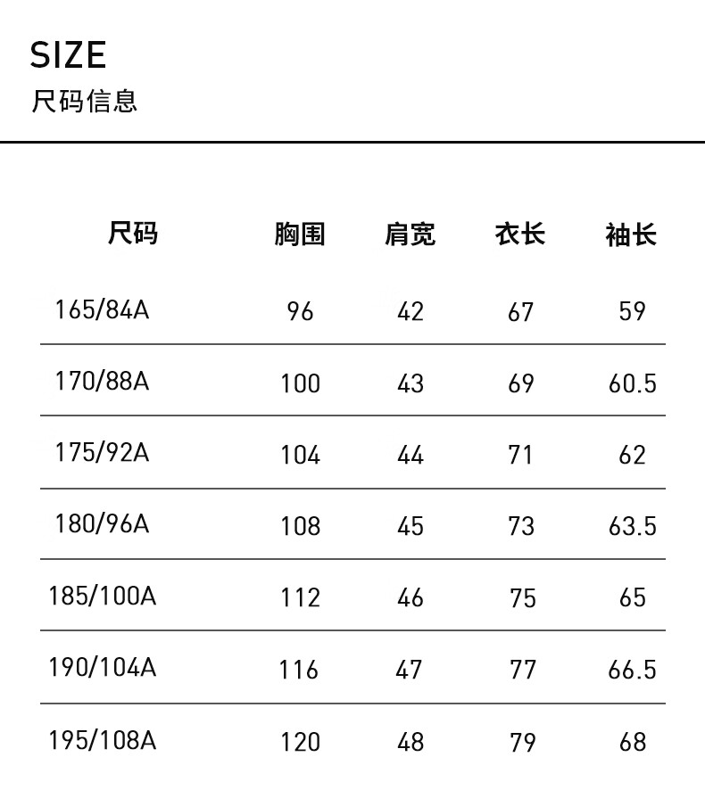 China (cm) 160-165/84-86 165-170 / 88-90 167-172 / 92-96 168-173 / 98-102 170-176 / 106-110