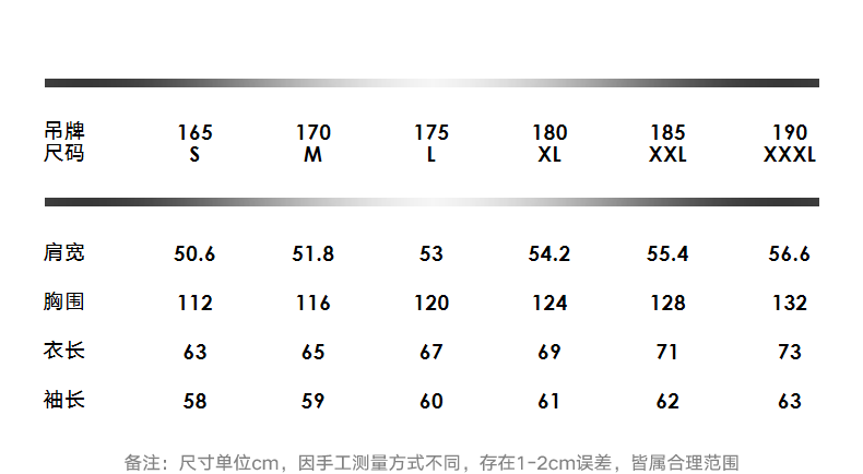 China (cm) 165 / 88-90 170 / 96-98 175 / 108-110 180 / 118-122 185 / 126-130