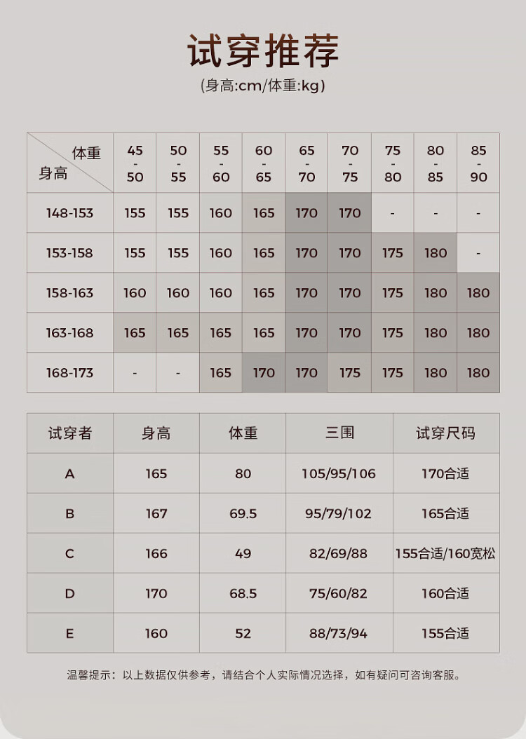 China (cm) 160-165/84-86 165-170 / 88-90 167-172 / 92-96 168-173 / 98-102 170-176 / 106-110