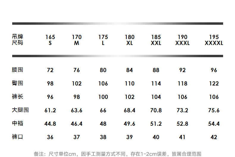Outseam (cm) 99 cm 101.5 cm 104 cm 106.5 cm 109 cm