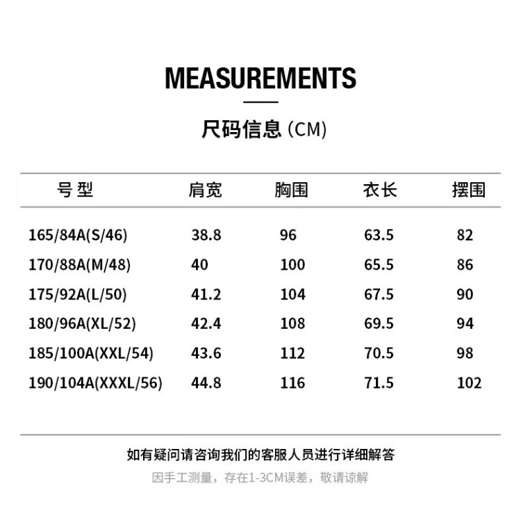 China (cm) 165 / 88-90 170 / 96-98 175 / 108-110 180 / 118-122 185 / 126-130