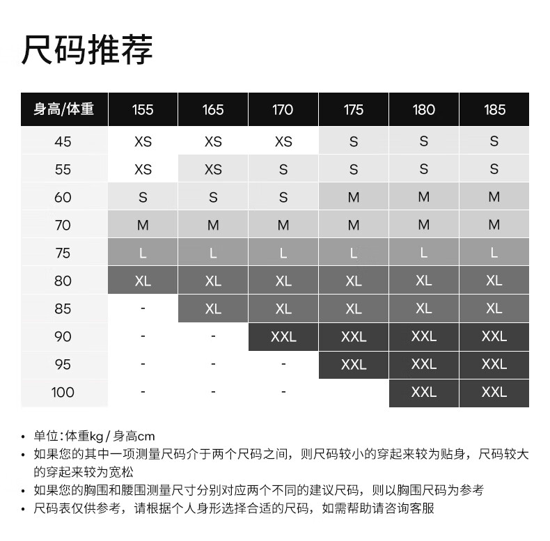 China (cm) 160-165/84-86 165-170 / 88-90 167-172 / 92-96 168-173 / 98-102 170-176 / 106-110