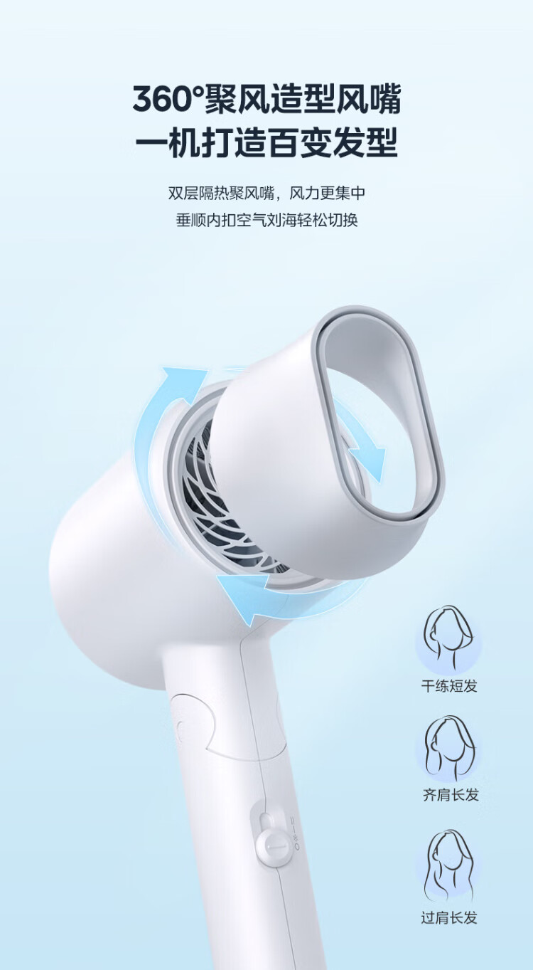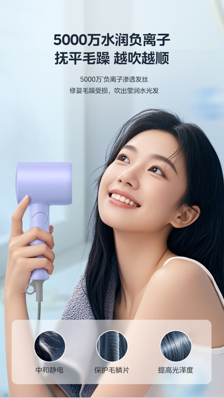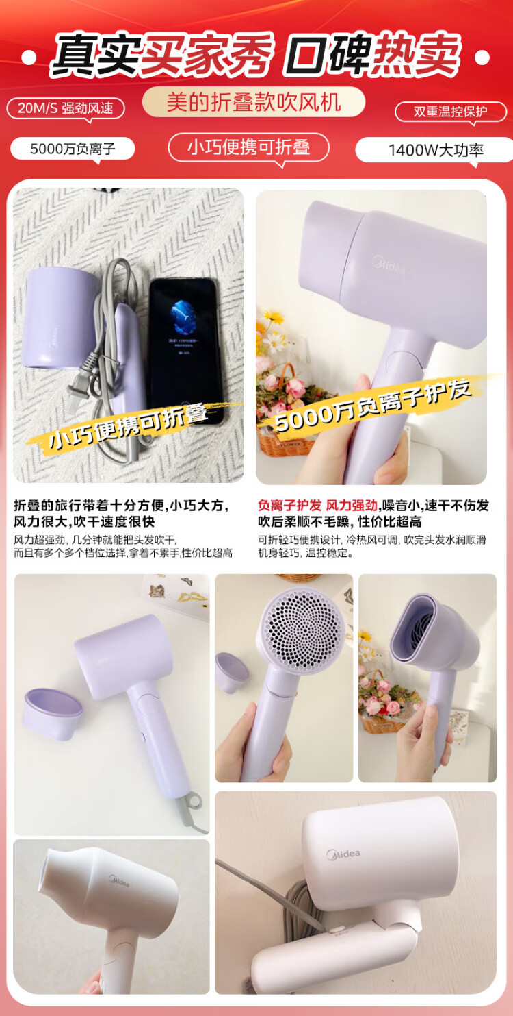 Midea 50 Million Negative Ion Protection Hair Dryer Folding Portable Hair Dryer Dormitory Hair Dryer FZ110 Purple 1400W Home Appliances National Subsidy Holiday/Birthday Gift