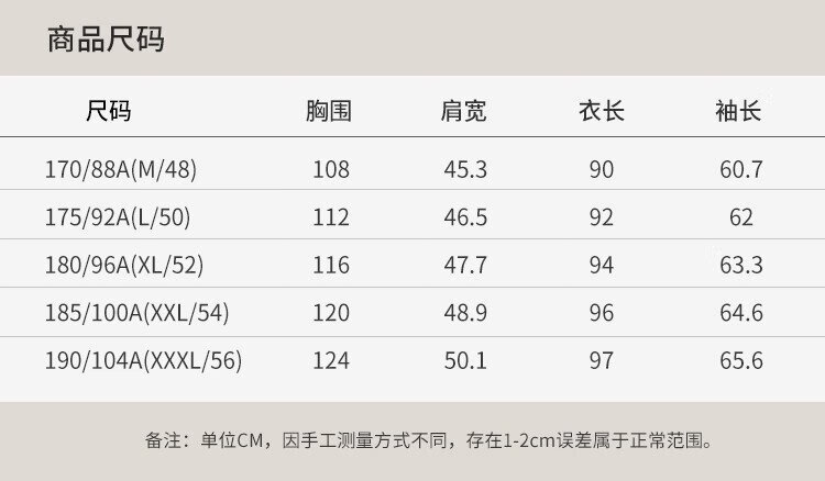 China (cm) 165 / 88-90 170 / 96-98 175 / 108-110 180 / 118-122 185 / 126-130