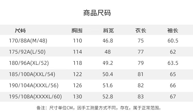 China (cm) 160-165/84-86 165-170 / 88-90 167-172 / 92-96 168-173 / 98-102 170-176 / 106-110