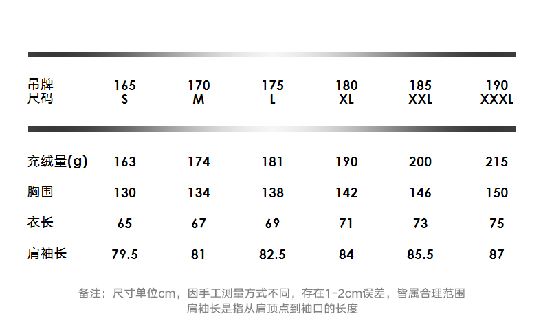 China (cm) 165 / 88-90 170 / 96-98 175 / 108-110 180 / 118-122 185 / 126-130