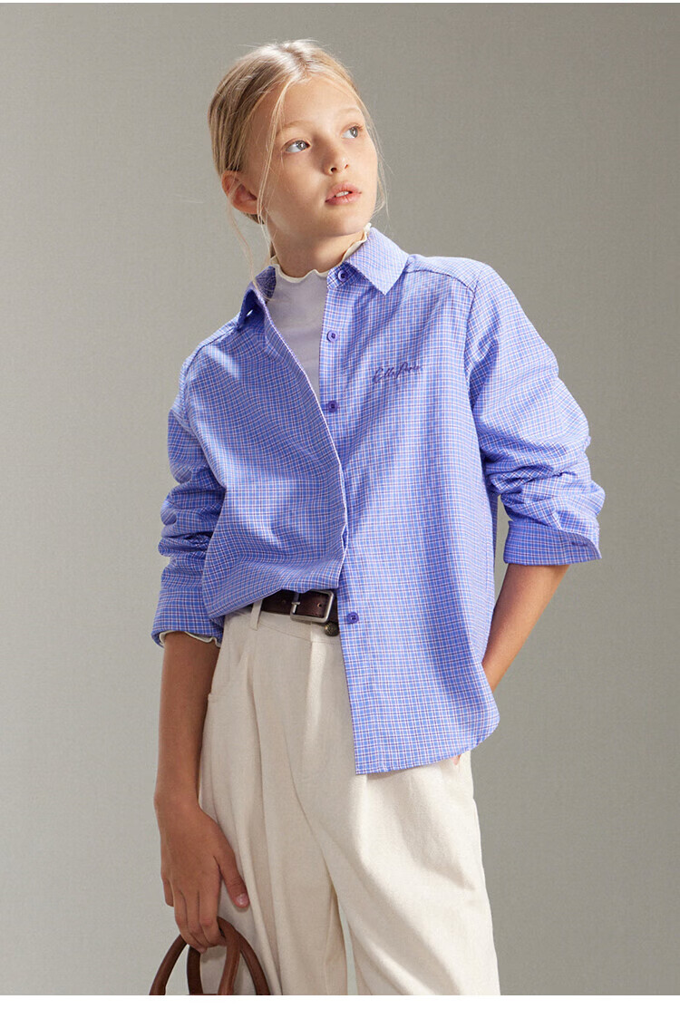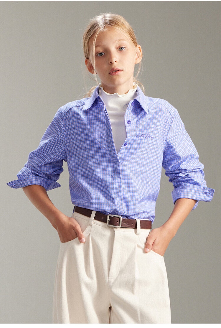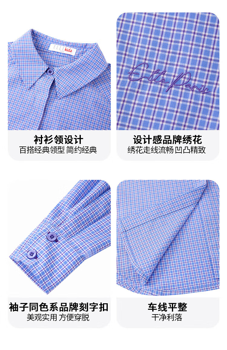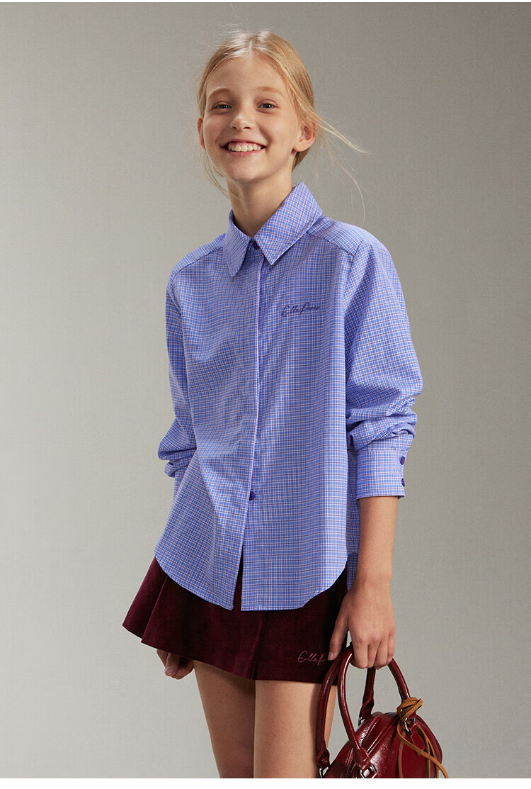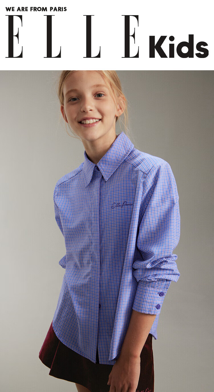 ELLE KIDS French girls spring new plaid embroidered soft and comfortable classic basic long-sleeved polo collar shirt