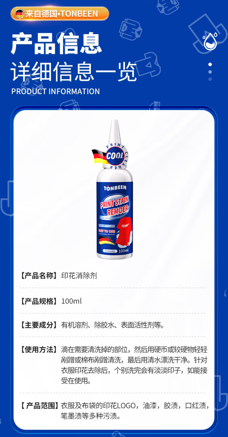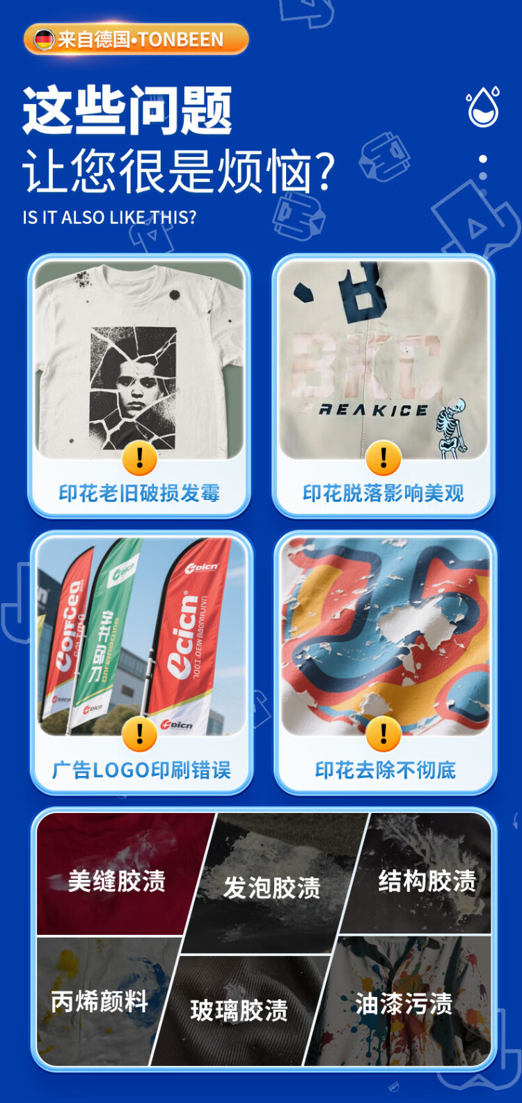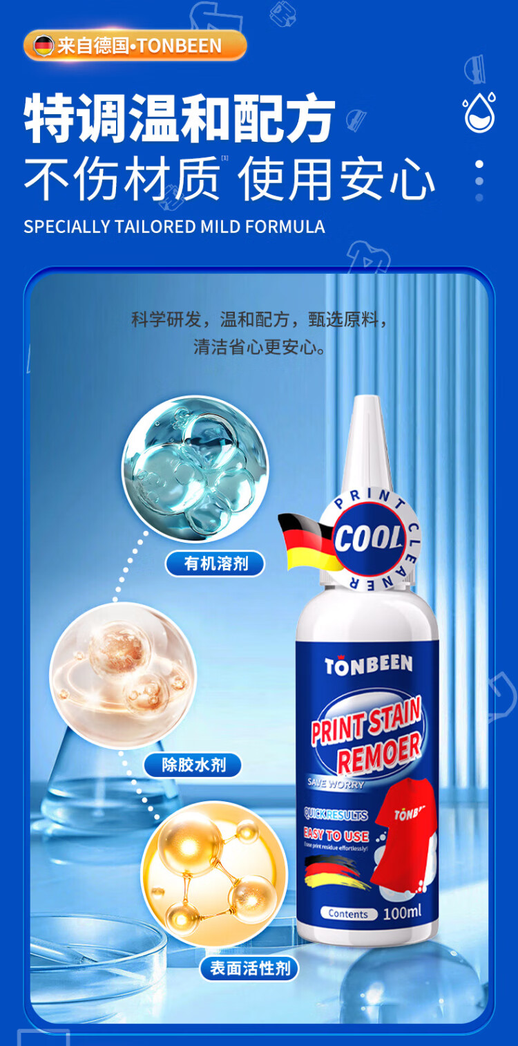 TONBEEN clothing printing remover logo letter down jacket glue remover removes clothing offset printing word trademark heat transfer 100mL