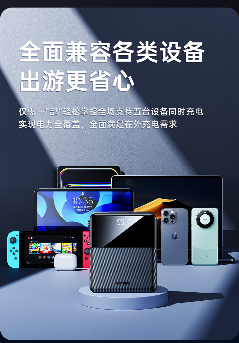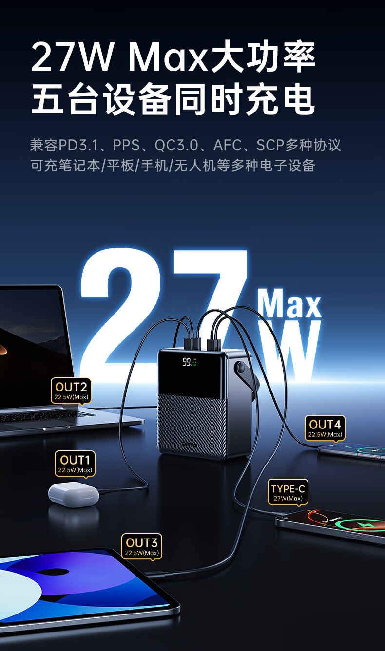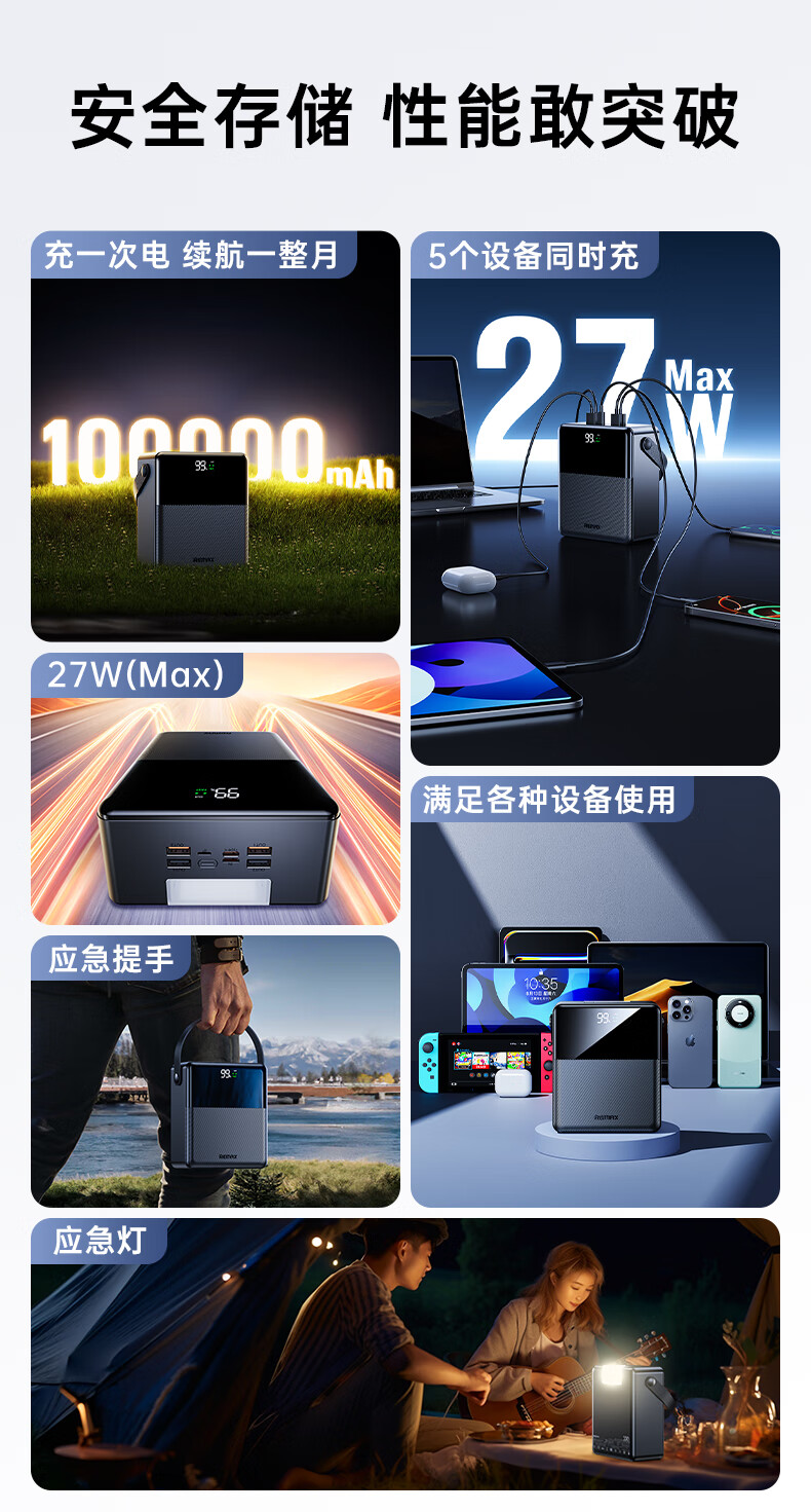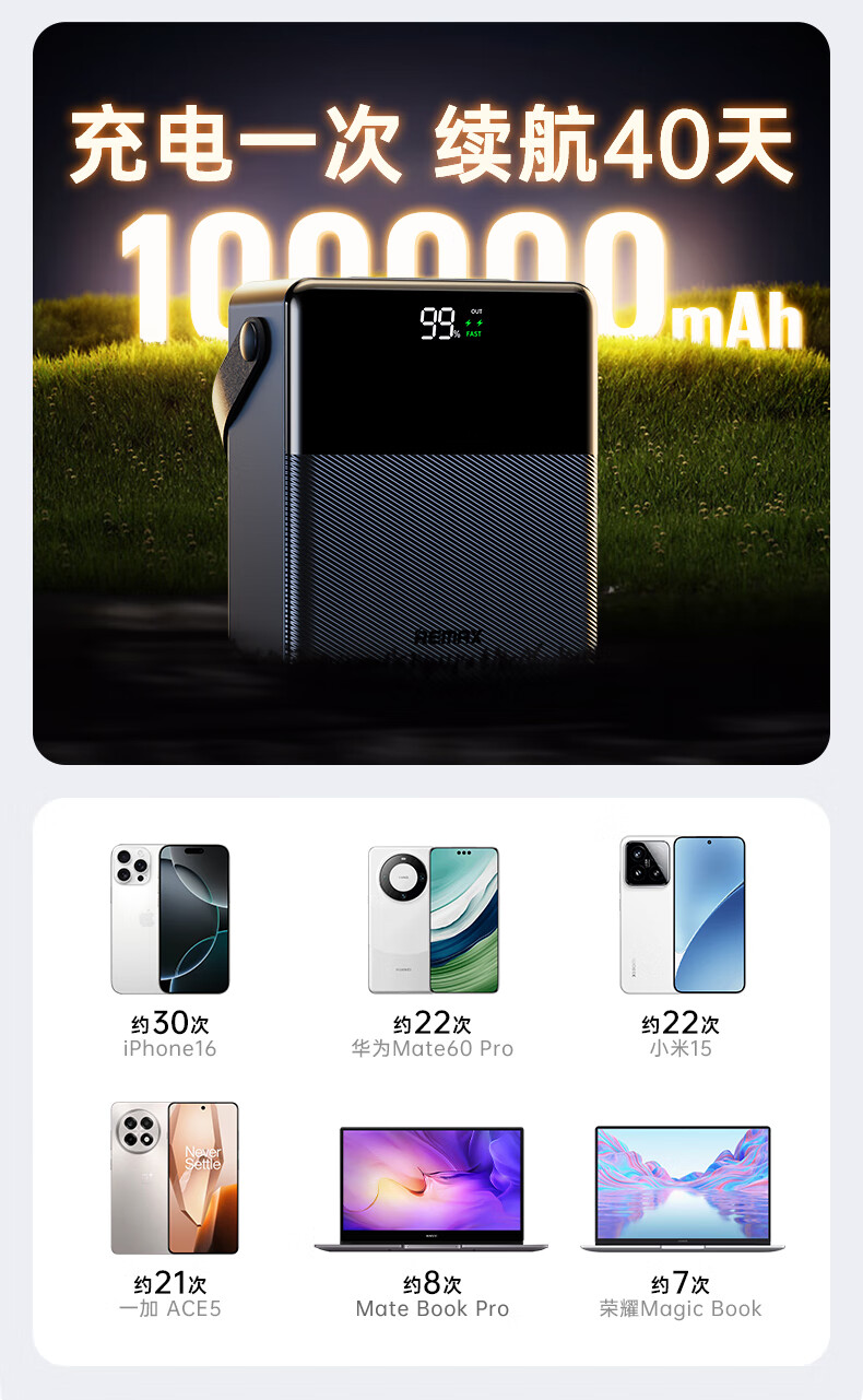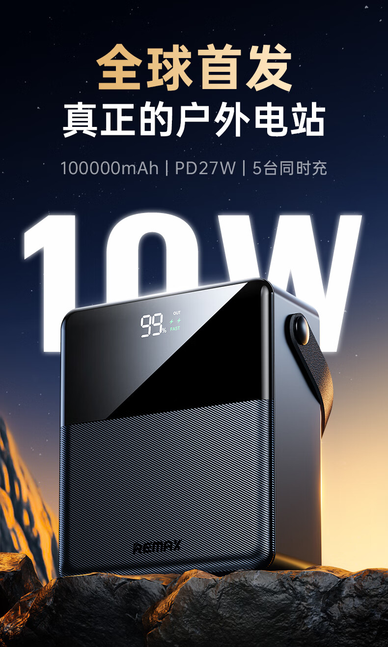 Remax is the industry's first 100,000 mAh 3C certified ultra-large capacity power bank PD27W super fast charging outdoor camping live broadcast high-power laptop power bank