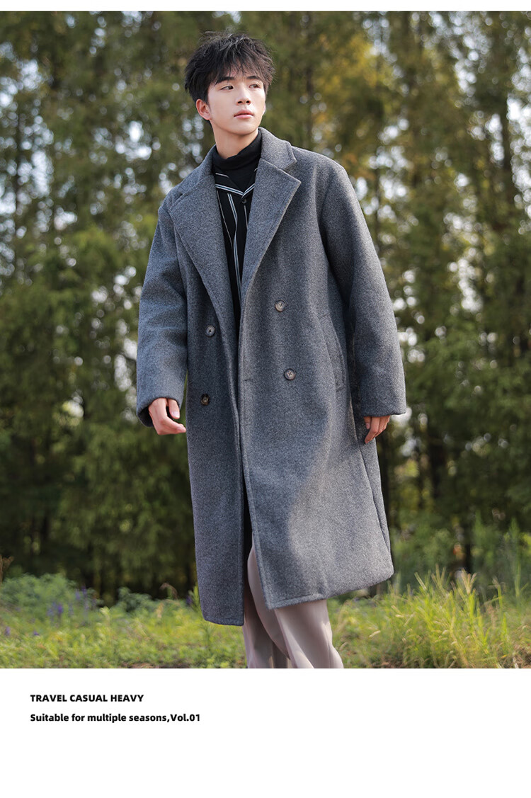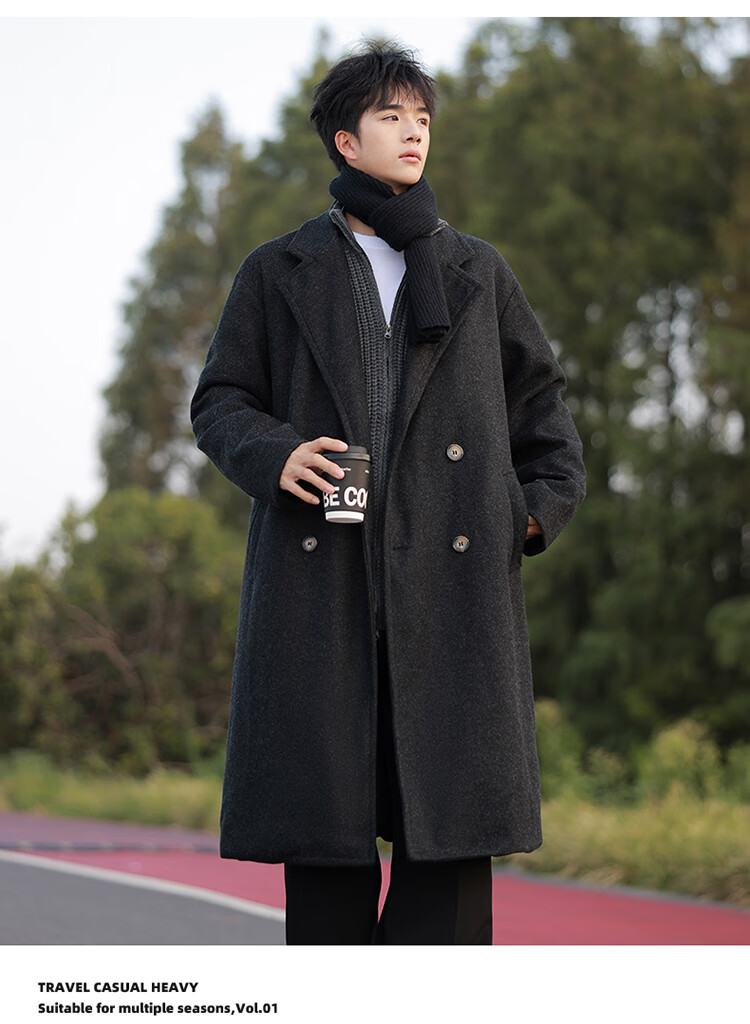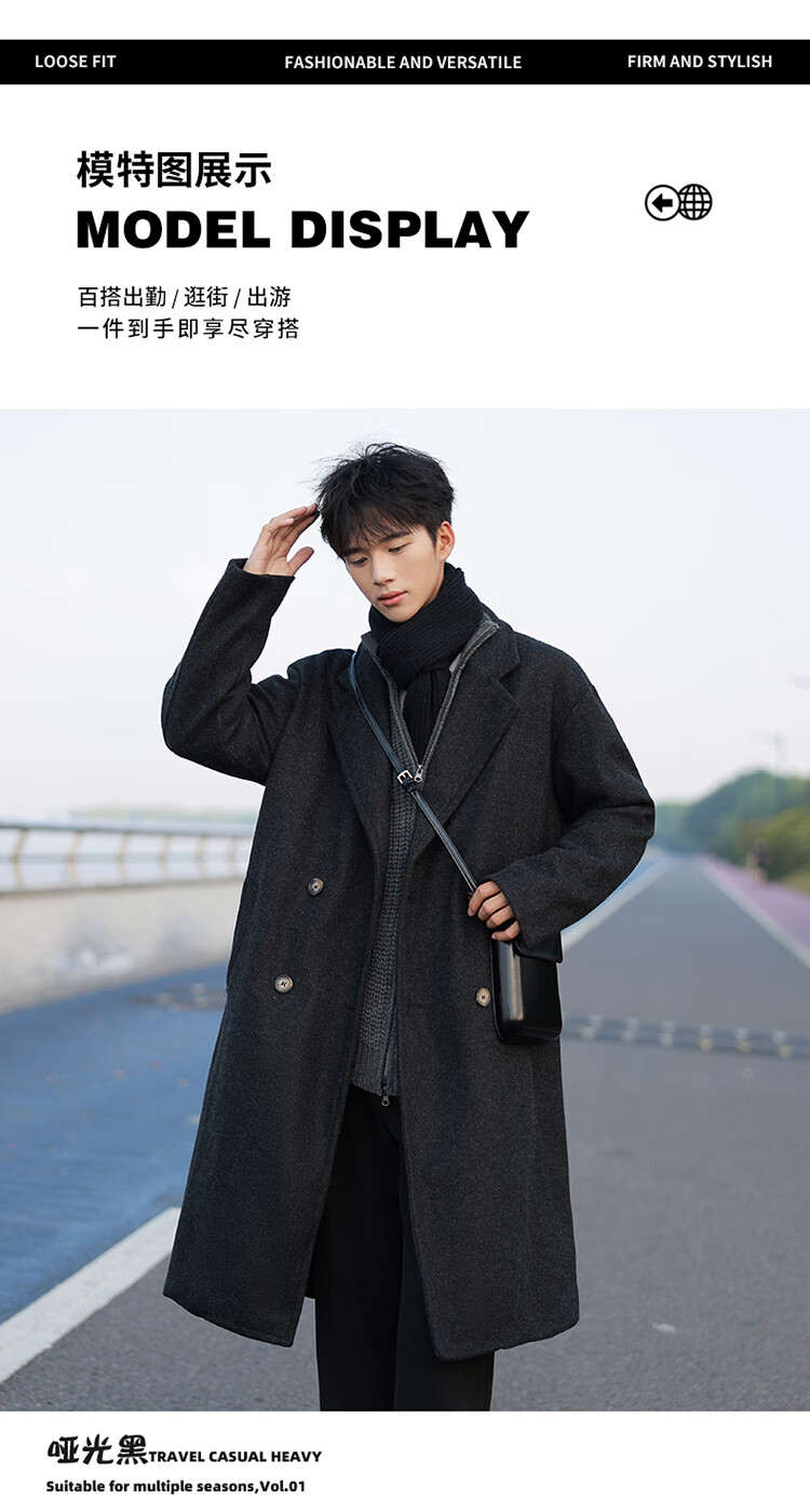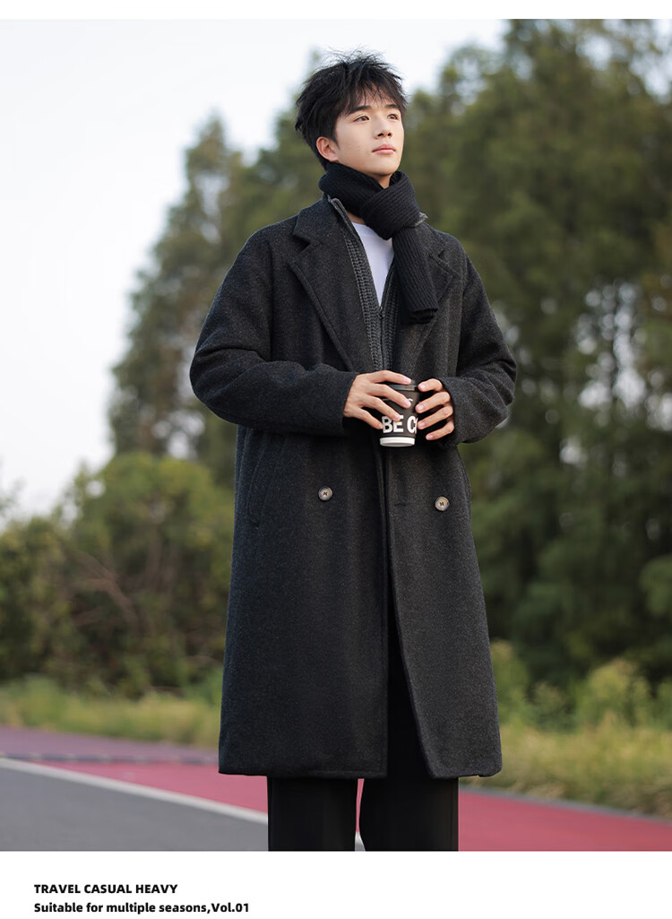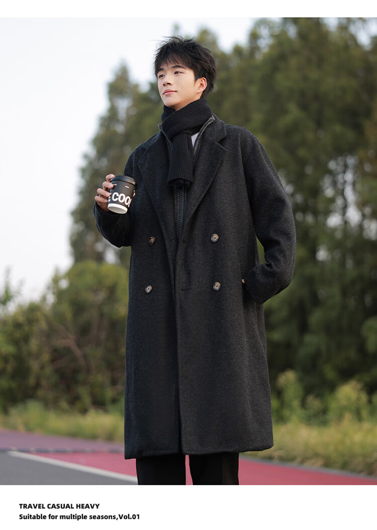 Dingfengbaoluo Korean style woolen coat for men winter mid-length thickened coat high-end double-breasted HK09 matte black L