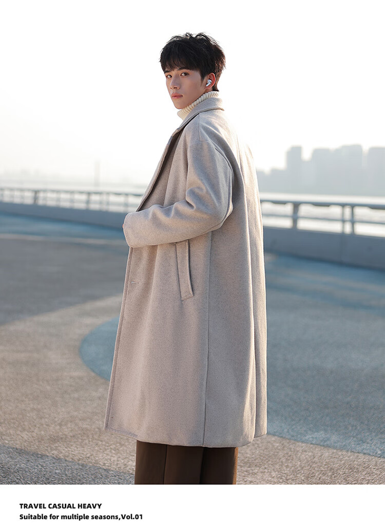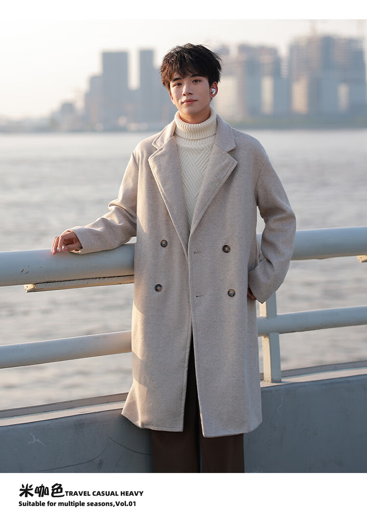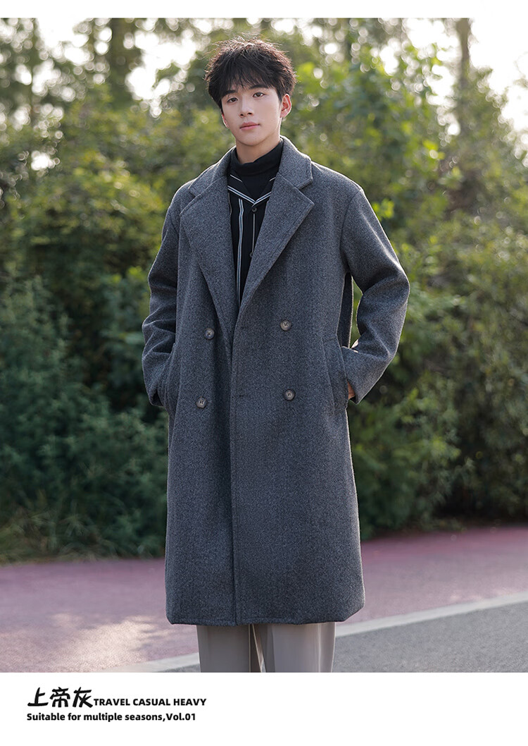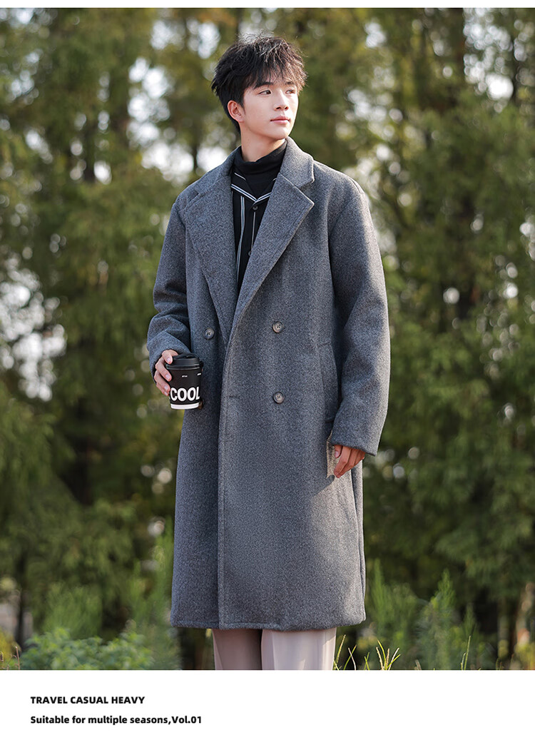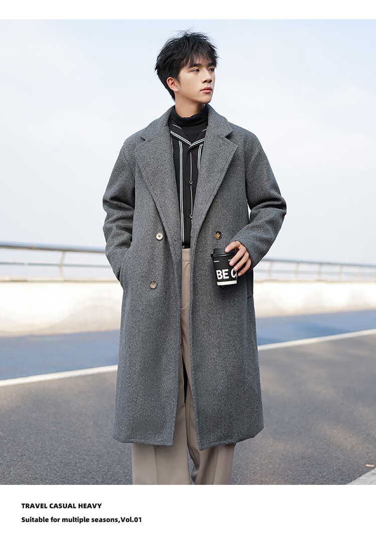 Dingfengbaoluo Korean style woolen coat for men winter mid-length thickened coat high-end double-breasted HK09 matte black L