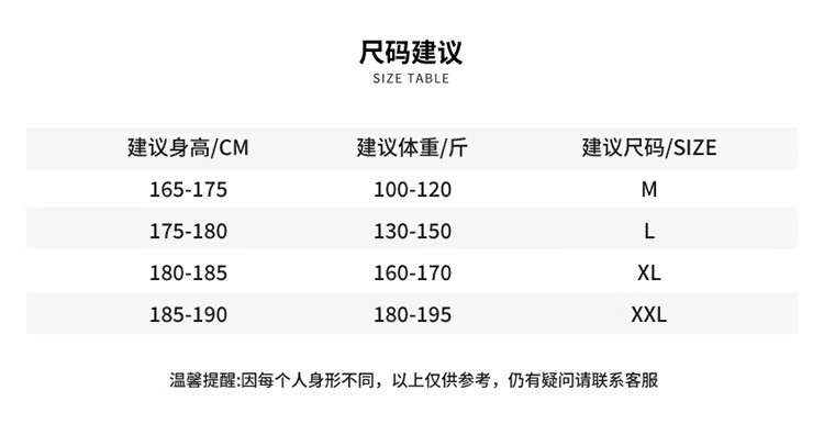 China (cm) 165 / 88-90 170 / 96-98 175 / 108-110 180 / 118-122 185 / 126-130